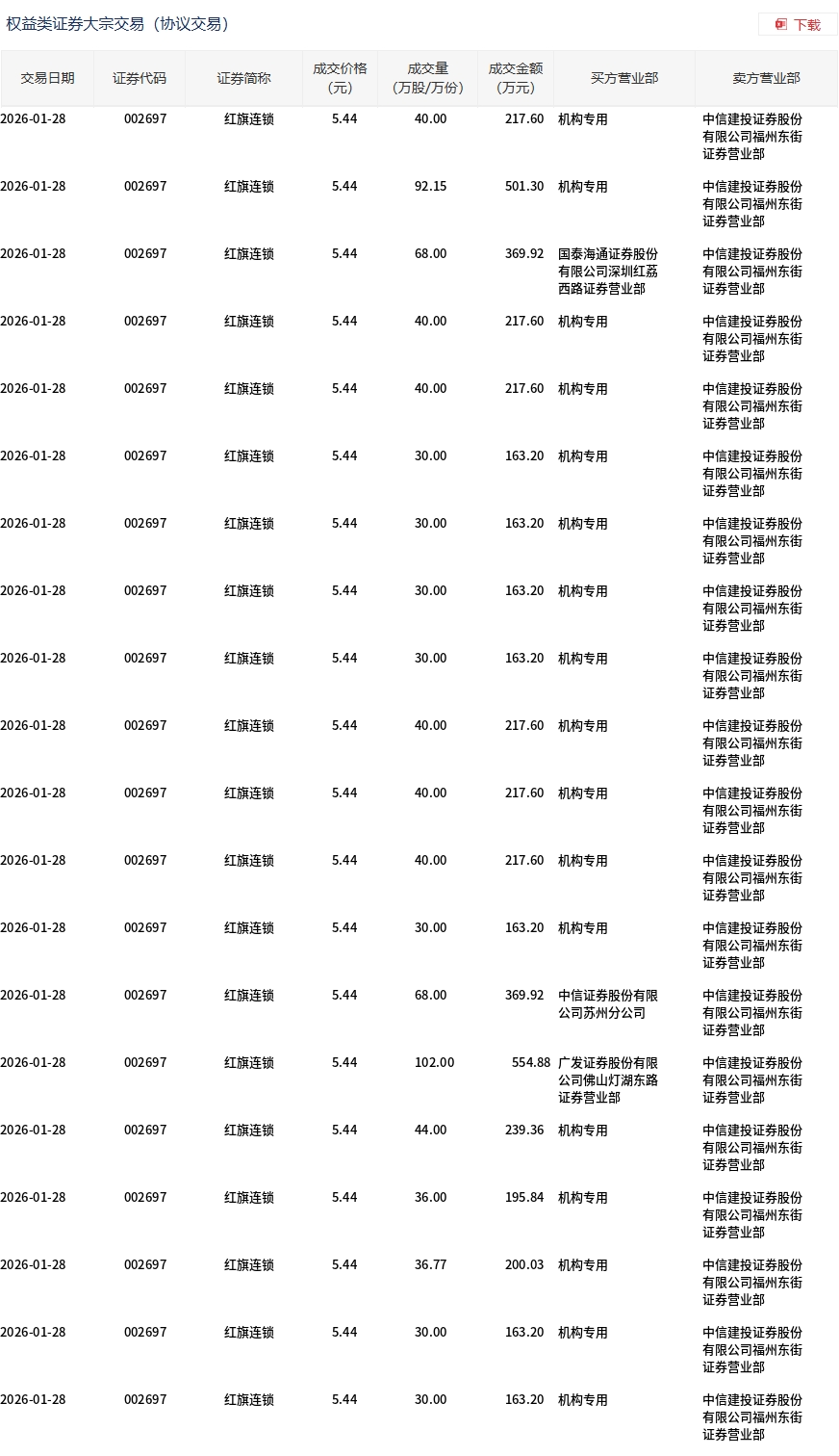 红旗连锁今日大宗交易折价成交964.92万股,成交额5249.17万元