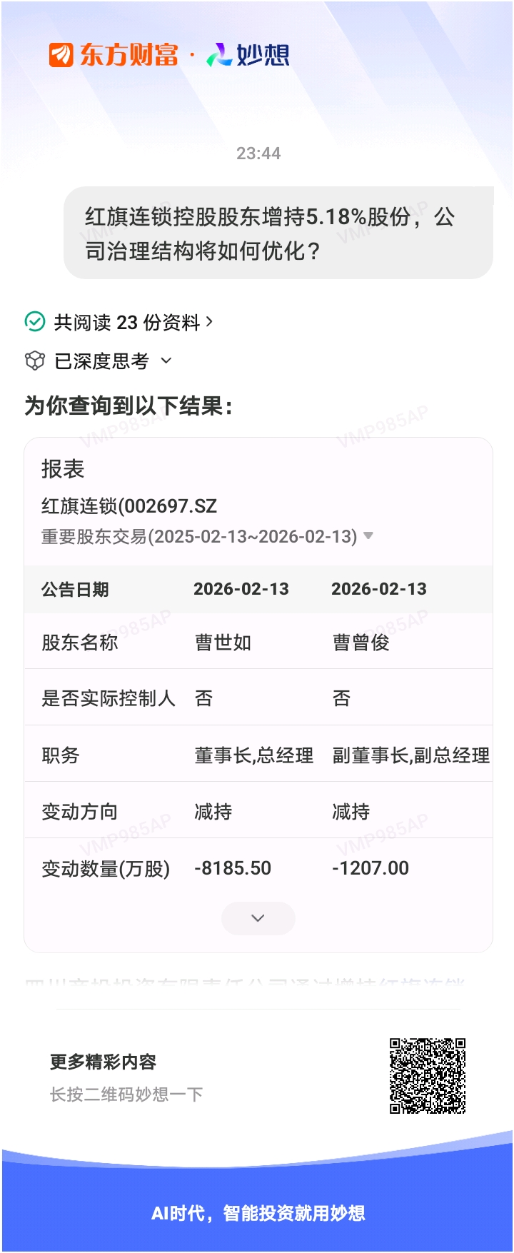 #@妙想,你怎么看?# 妙想一下:红旗连锁控股股东增持5.18%股份,公司治理结构将如何优化?