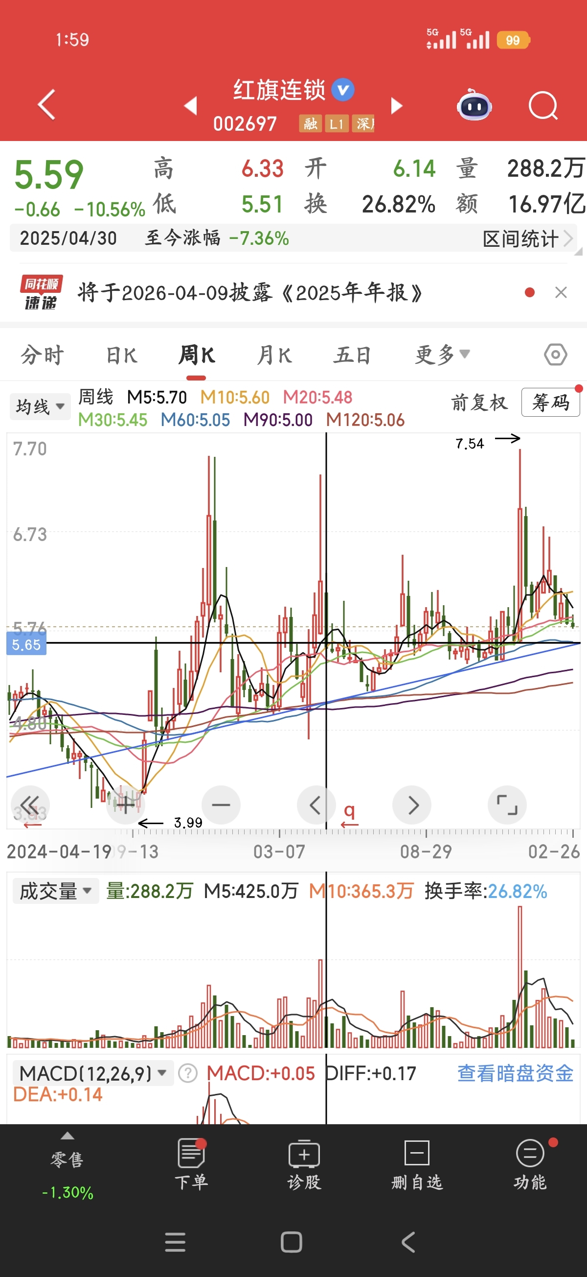 $红旗连锁(SZ002697)$ 周线趋势线再加仓,现在买就是送钱喔,下周趋势线在5.65