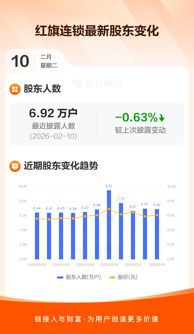 红旗连锁:截至2月10日最新股东户数6.92万户,较上期减少0.63%