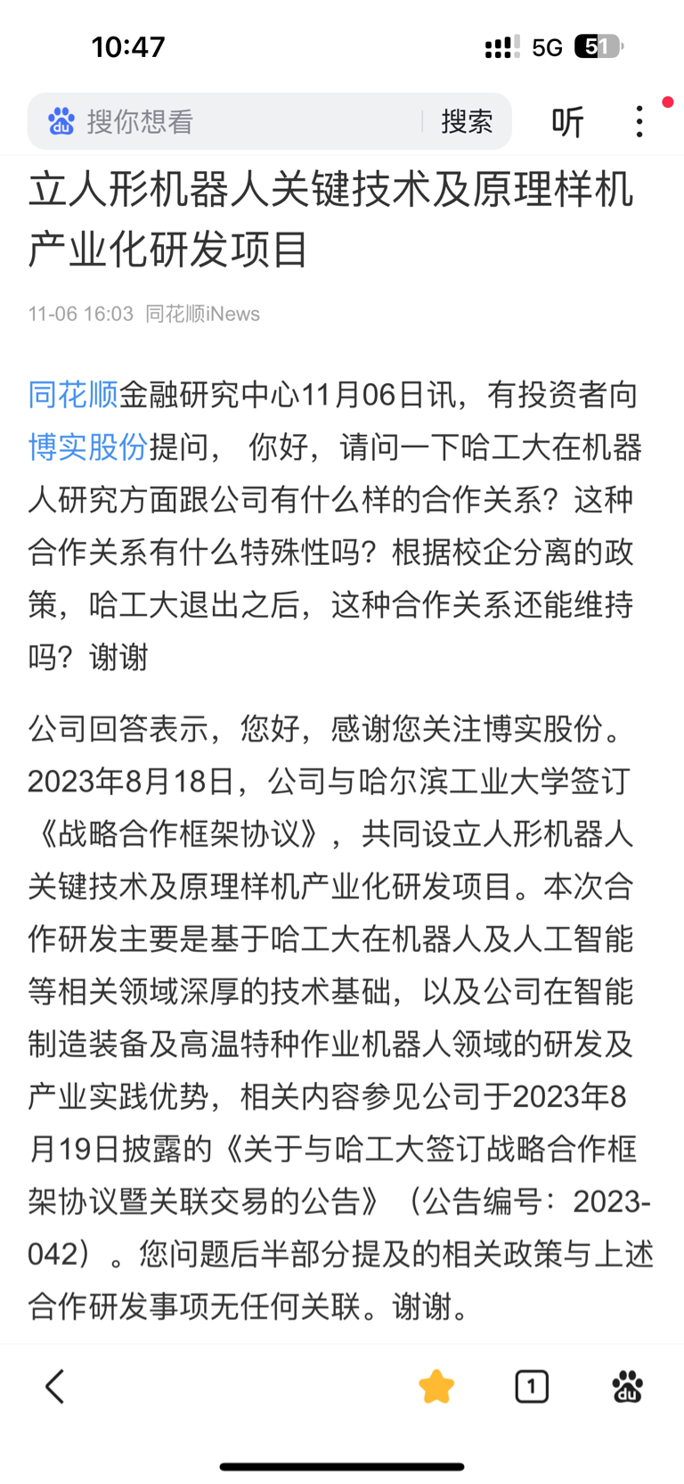$博实股份(SZ002698)$ 11月6号有投资者在采访中问到:根据校企分离的政策,公司与哈工大这种合作关系还能维持吗?