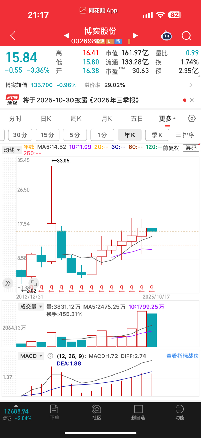 $博实股份(SZ002698)$ 又到了我唱多博实给大家打气的时候了,拿住博实到 2025年12月31日年线收盘,股价大概率可以收在16.75*(1+10%)=18.43元上面,还有两个半月的时间,做出这个判断的依据是一,今年基本面没有变坏,二,最近四年年线每年收涨≥10%,长期看好博实股份的长线价值投资的股友们,多一点信心和耐心吧,拿住博实不会亏钱。