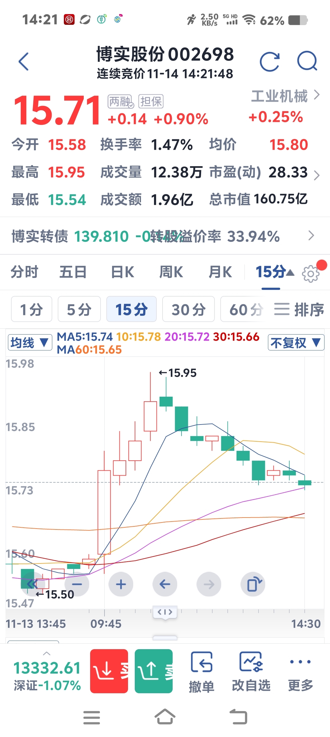 $博实股份(SZ002698)$ 15分钟2浪调整差不多了,该组织3浪反击了。