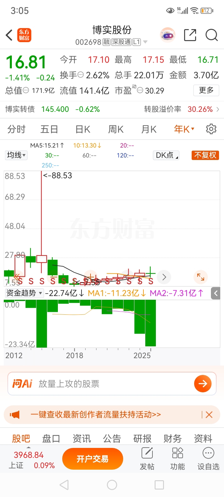 $博实股份(SZ002698)$ 主力资金一直在流出