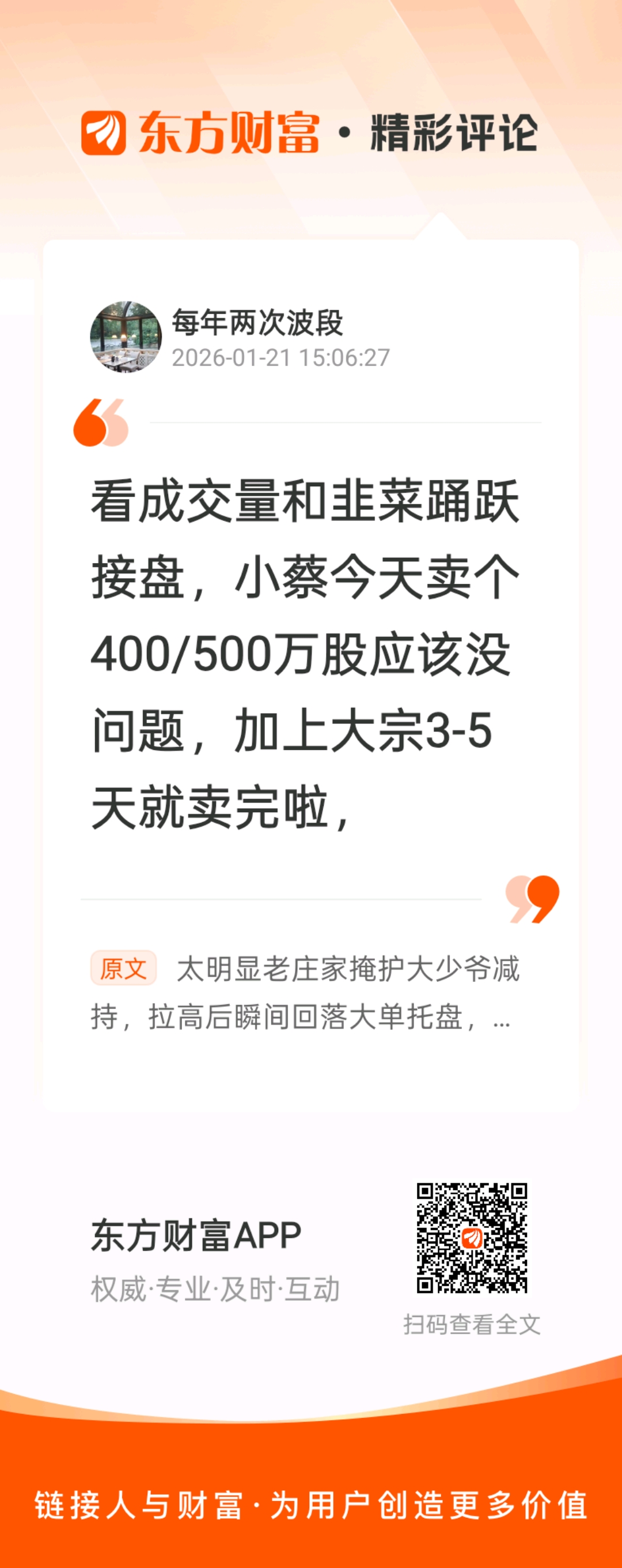 温馨提示: 1.根据《证券法》规定,禁止编造、传播虚假信息或者误导性信息,扰乱证券市场;2.用户在本社区发表的所有资料、言论等仅代表个人观点,与本网站立场无关,不对您构成任何投资建议。用户应基于自己的独立判断,自行决定证券投资并承担相应风险。《东方财富社区管理规定》