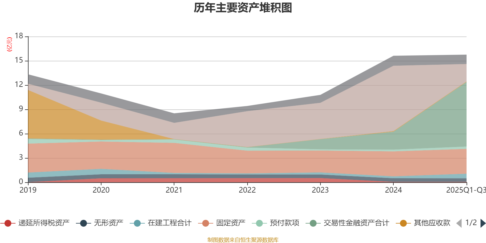 资产重大变化方面,截至2025年三季度末,公司货币资金较上年末减少73.35%,占公司总资产比重下降38.06个百分点;交易性金融资产合计较上年末增加260.68%,占公司总资产比重上升36.49个百分点;在建工程合计较上年末增加142.93%,占公司总资产比重上升2.11个百分点;预付款项较上年末增加40.16%,占公司总资产比重上升0.53个百分点。