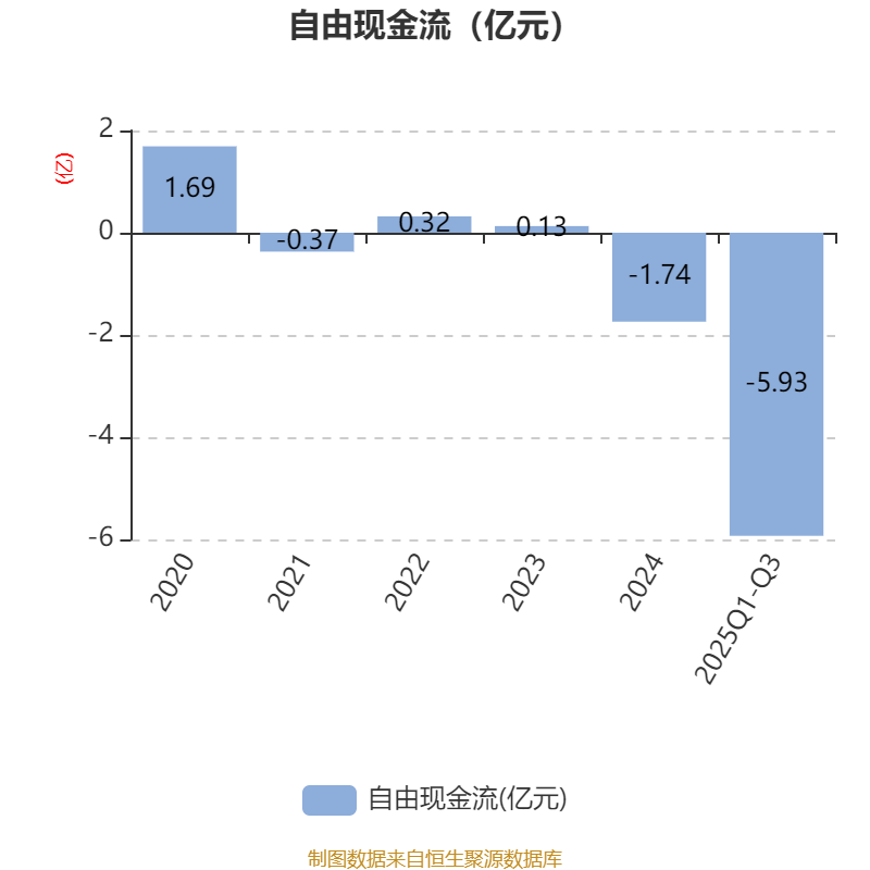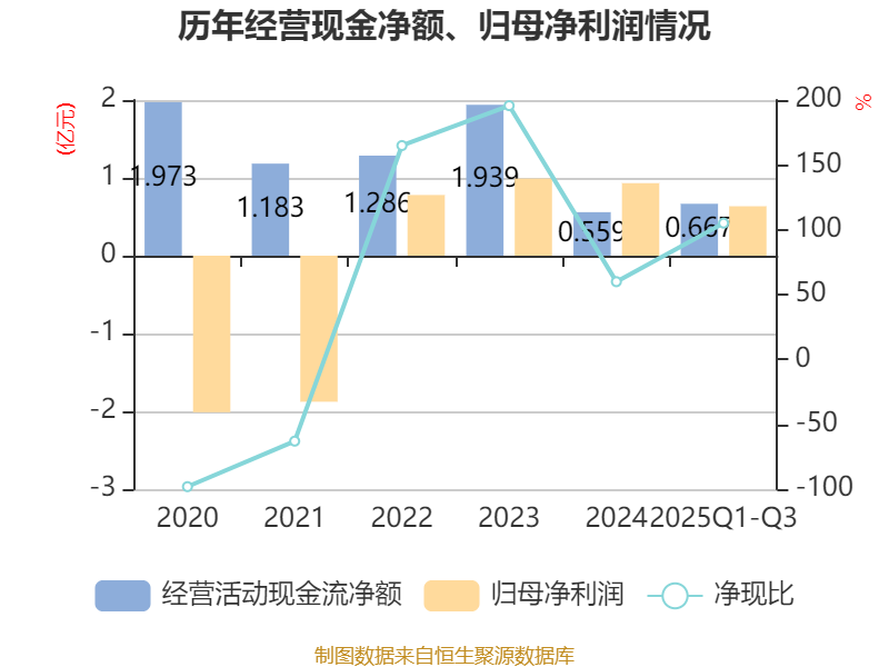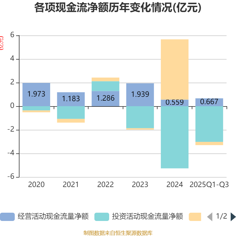 2025年前三季度,公司经营活动现金流净额为6669.66万元,同比增长113.04%;筹资活动现金流净额-2747.38万元,同比增加54.79万元;投资活动现金流净额-3.02亿元,上年同期为2636.25万元。