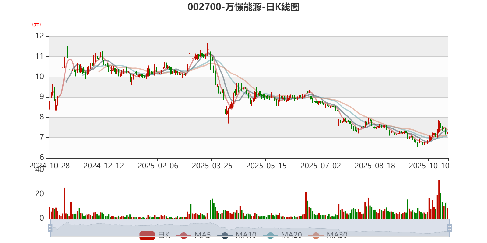 中证智能财讯万憬能源(002700)10月28日披露2025年第三季度报告。前三季度公司实现营业总收入4.82亿元,同比下降2.06%;归母净利润6345.2万元,同比下降22.73%;扣非净利润5171.09万元,同比下降32.08%;经营活动产生的现金流量净额为6669.66万元,同比增长113.04%;报告期内,万憬能源基本每股收益为0.1534元,加权平均净资产收益率为4.71%。