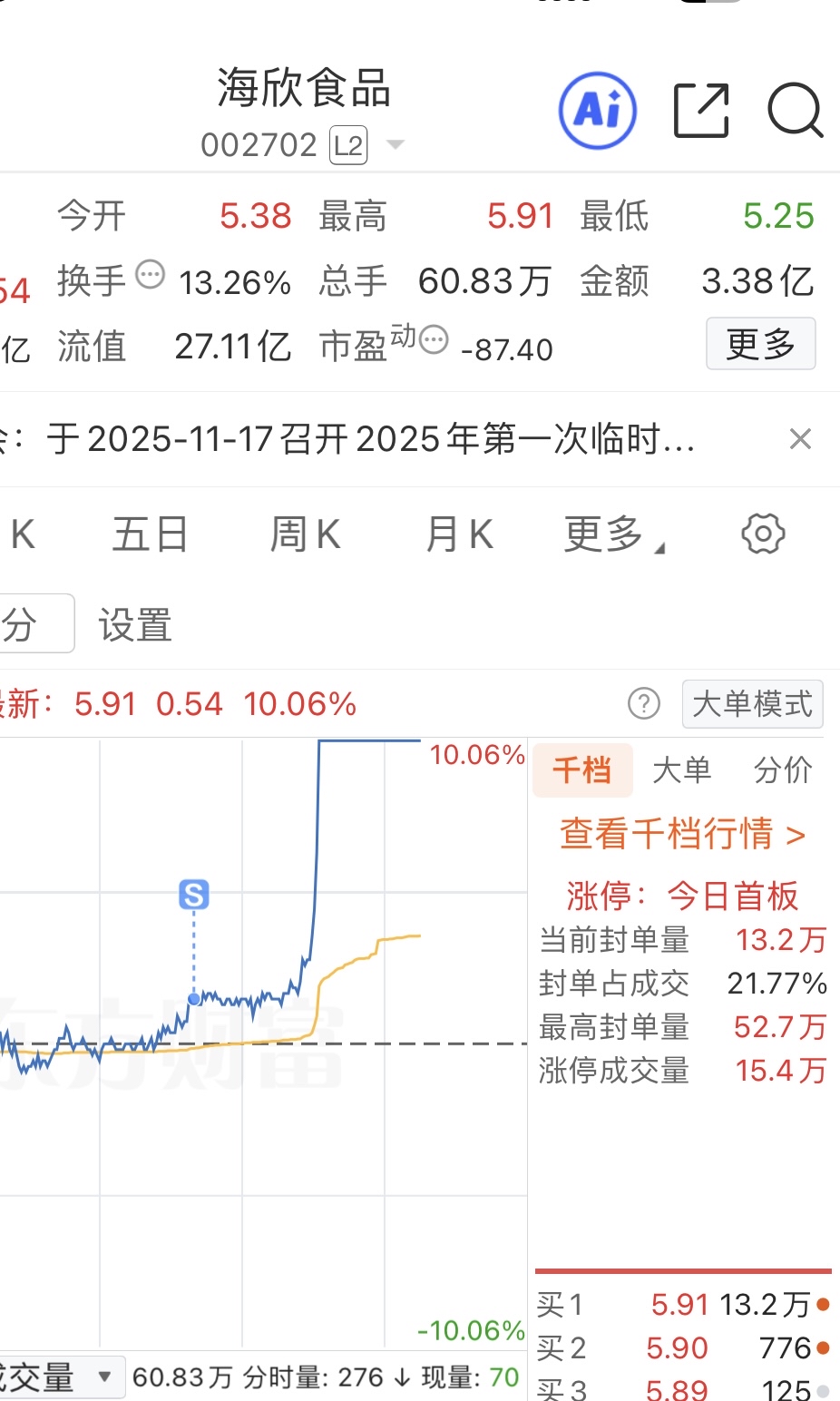 $海欣食品(SZ002702)$ 给我洗出去了
