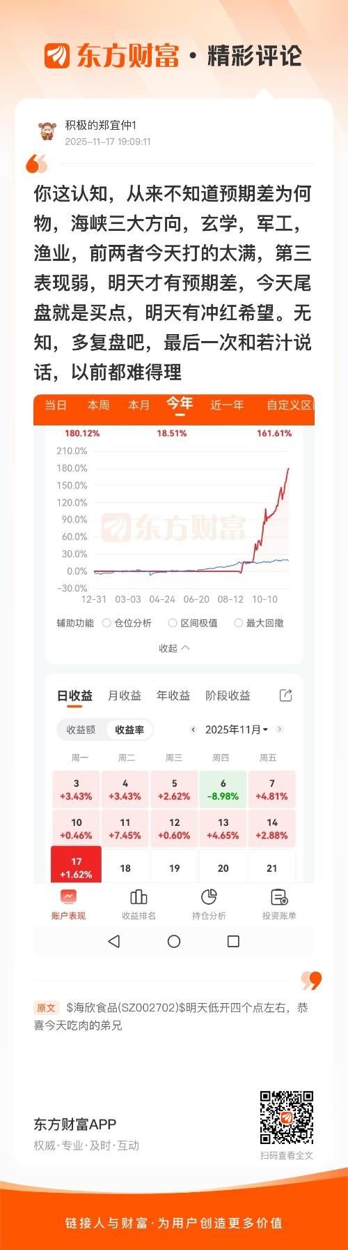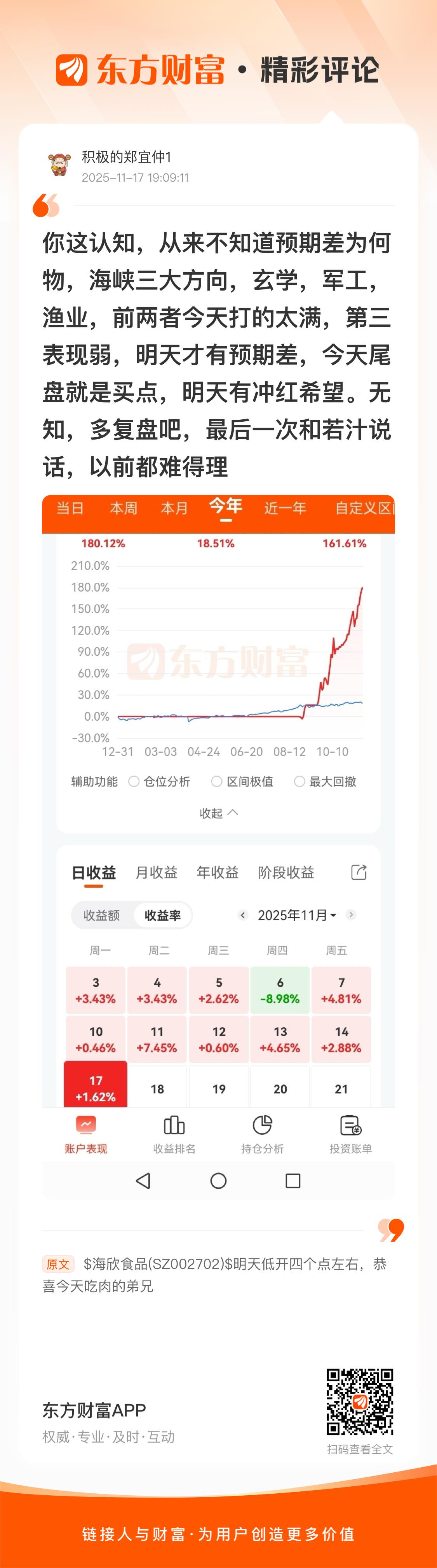 我真不知道啊,可以讲一下吗?//@积极的郑宜仲1 : 回复 广州一代战神 :你这认知,从来不知道预期差为何物,海峡三大方向,玄学,军工,渔业,前两者今天打的太满,第三表现弱,明天才有预期差,今天尾盘就是买点,明天有冲红希望。无知,多复盘吧,最后一次和若汁说话,以前都难得理