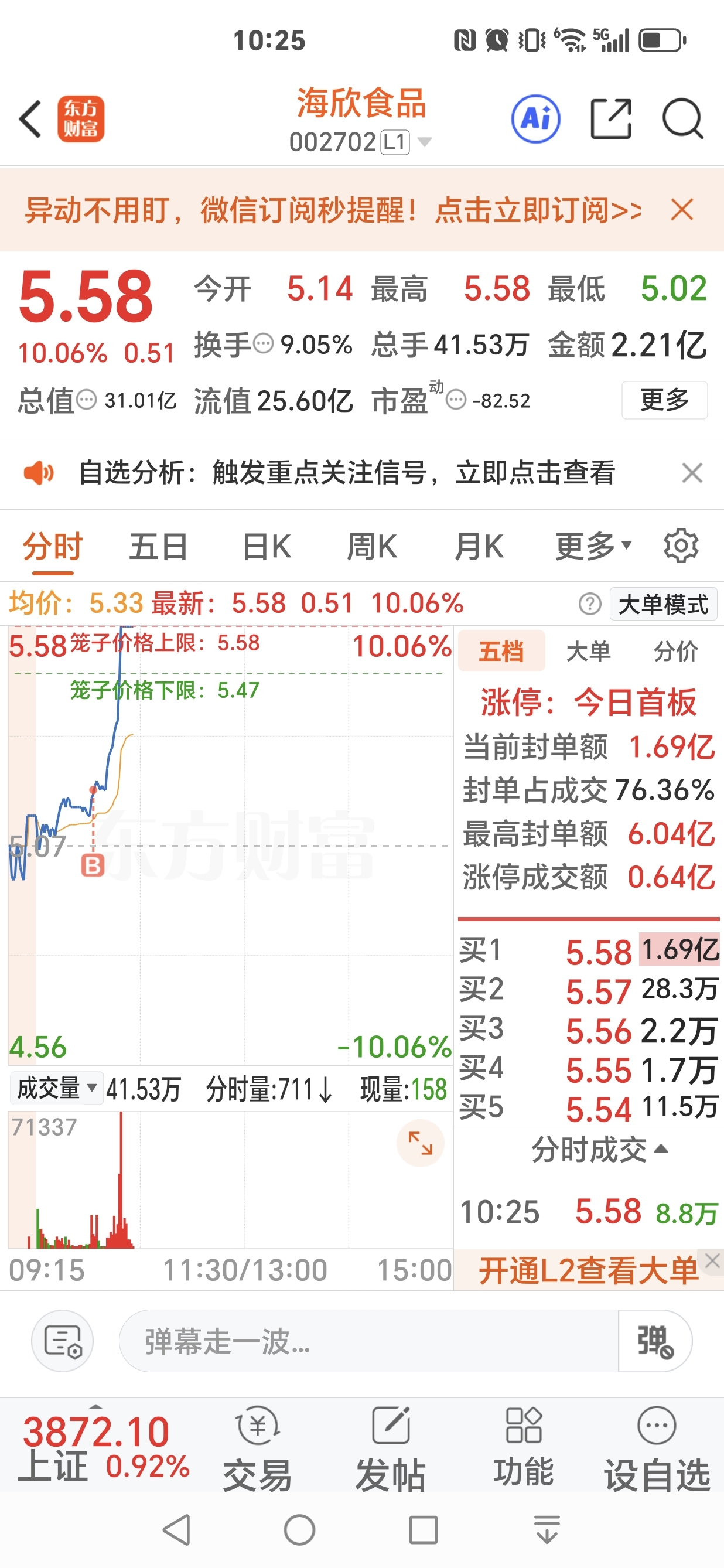 $海欣食品(SZ002702)$ 获利盘跑的真快,但不影响它涨势。