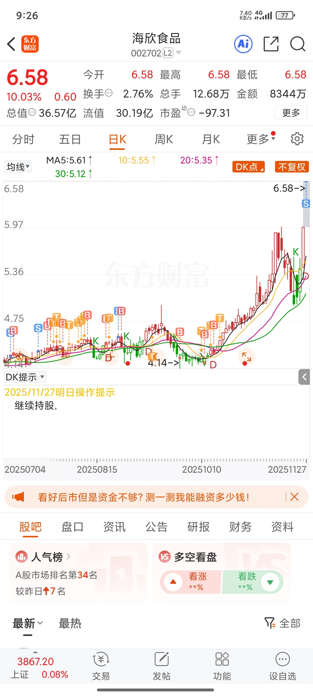 $海欣食品(SZ002702)$ 走了哈,达到预期了