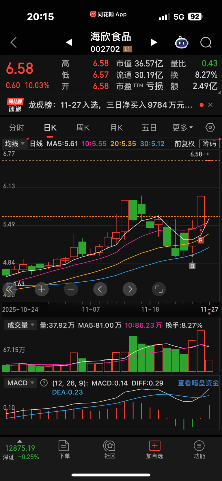 $海欣食品(SZ002702)$ 这个股启动有点早,下个月大炒消费,感觉还挺有预期的,就是不知道庄家是不是三板组控盘的了,明天涨停下砸看承接了,如果顺利接过接力棒的话,此股也不是没有破前高的希望!加油吧