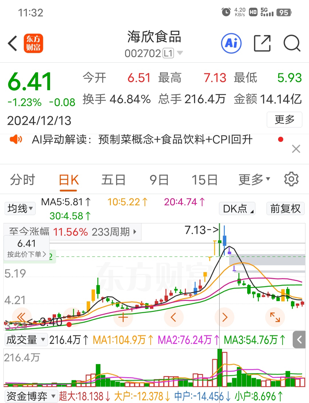 $海欣食品(SZ002702)$ 和2024年12月13日的走势一模一样,同样的地天板,然后,后续持续大跌。