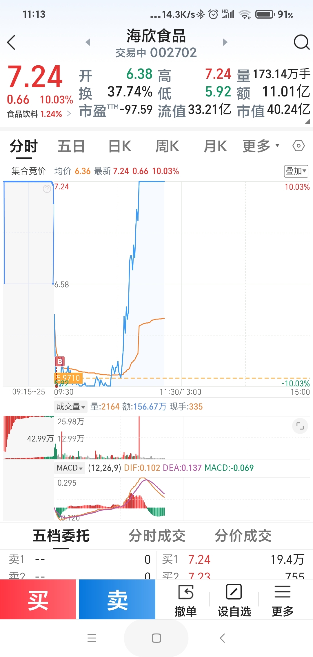 $海欣食品(SZ002702)$ 昨天晚上研究筛选出来的,感觉资金量和趋势形态都还不错,就加入了自选,早上偶见跌停,心理预估可能会拔地而起,就跌停价附近果断上车了,结果十点五十左右居然真的如我所期,就是弄的不够多,权当试水