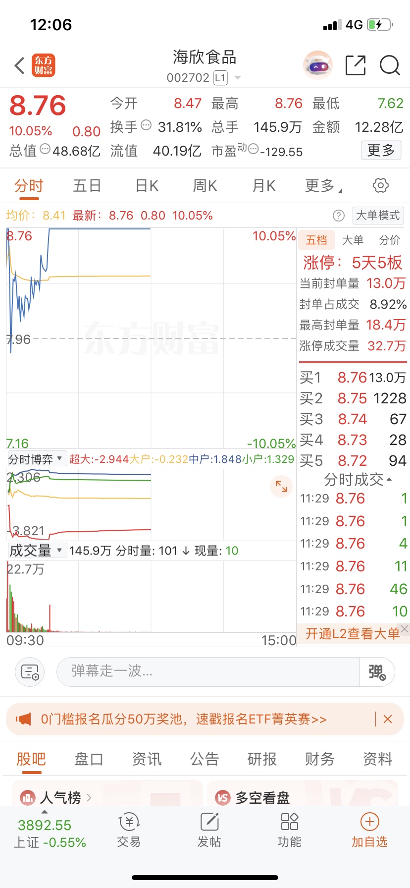每天一更新,气死那些踏空的空狗,今天5连板了,有5板就必有7板。同是福建板块这涨幅和平潭合富比还在刚起步,至少我觉得海欣食品不管题材还是业绩都比那两好,12月不做食品消费行情的你绝对会踏空行情
