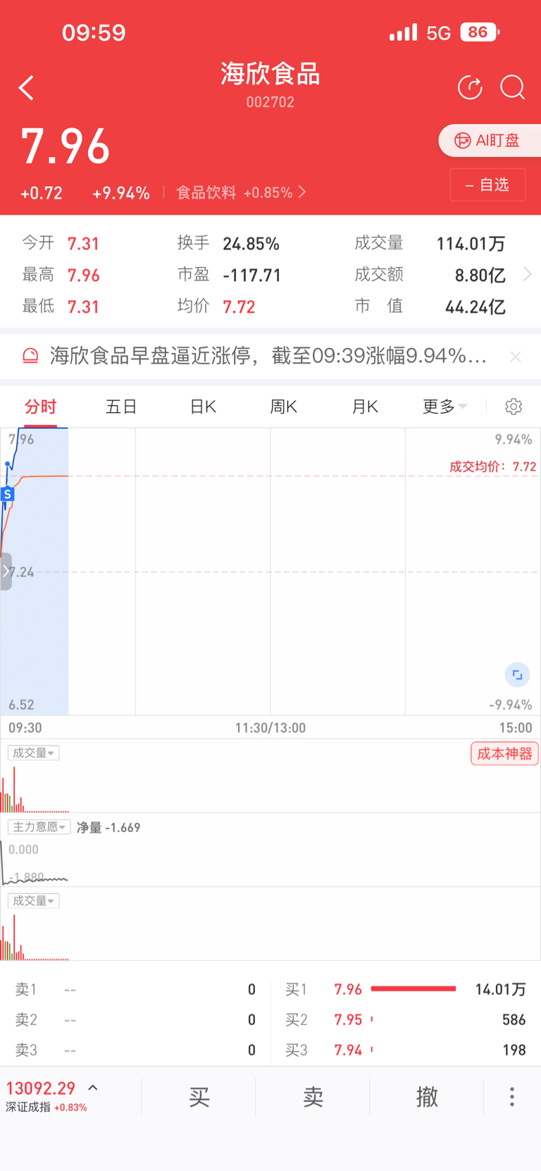 $海欣食品(SZ002702)$ 洗出昨天跌停进的不坚定筹码
