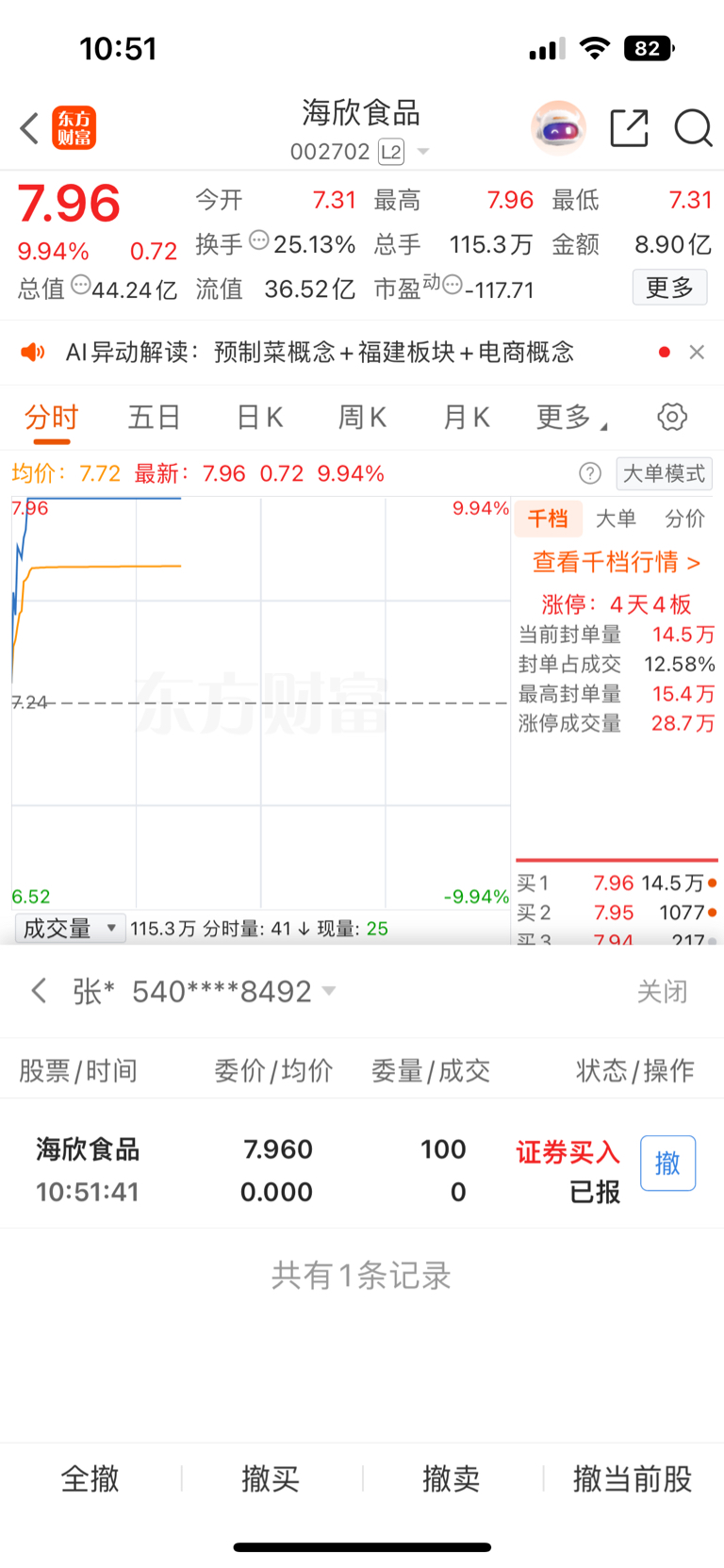 $海欣食品(SZ002702)$ 真稳,试试封板强度多高