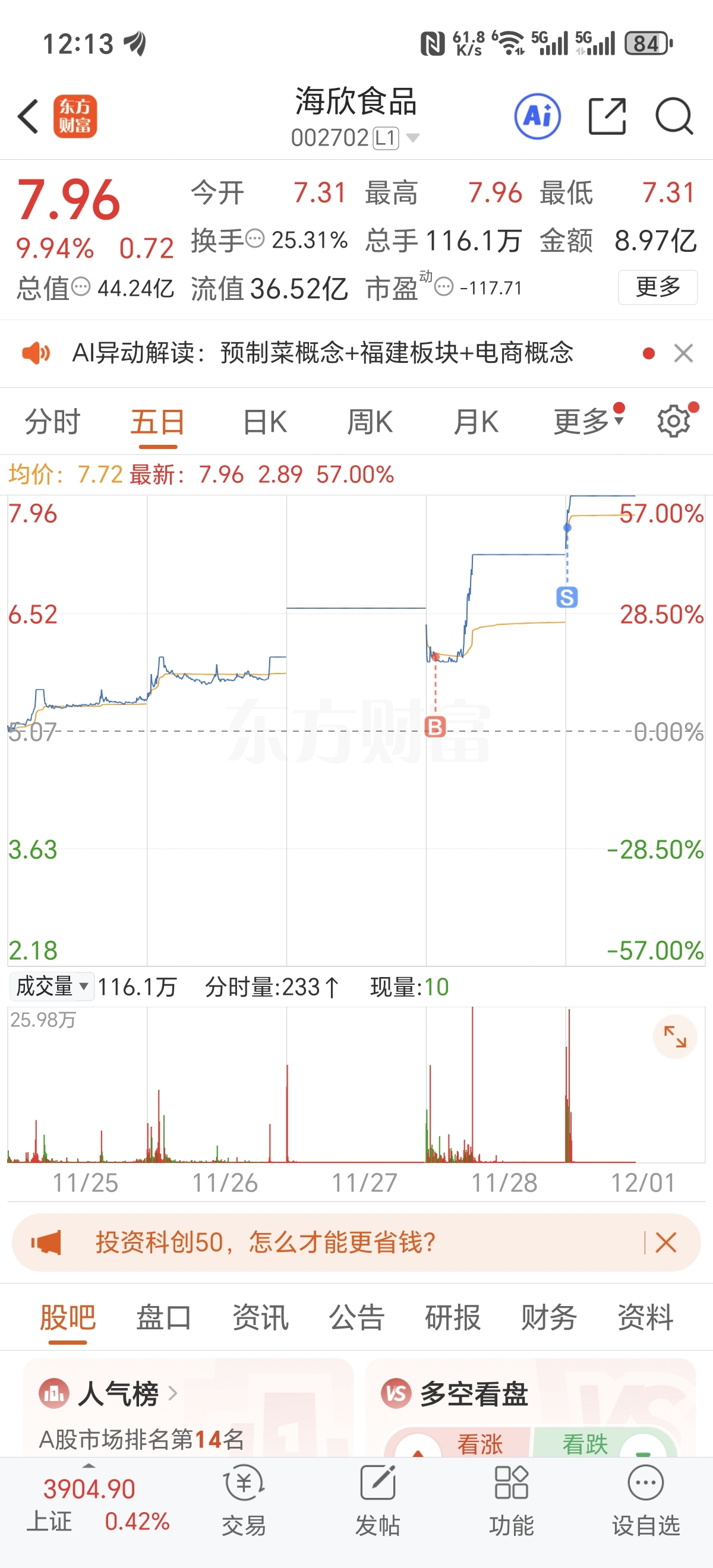 $海欣食品(SZ002702)$ 感谢主力给机会走#收盘点评#