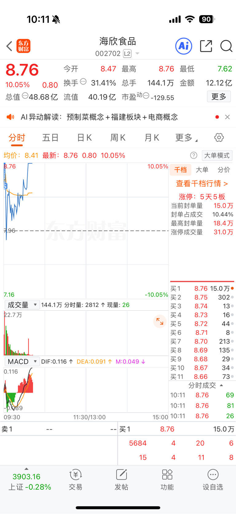 $海欣食品(SZ002702)$ 涨停卖了后,本想着它不跌破昨日涨停价再择机接回,现在看还是不够果断。