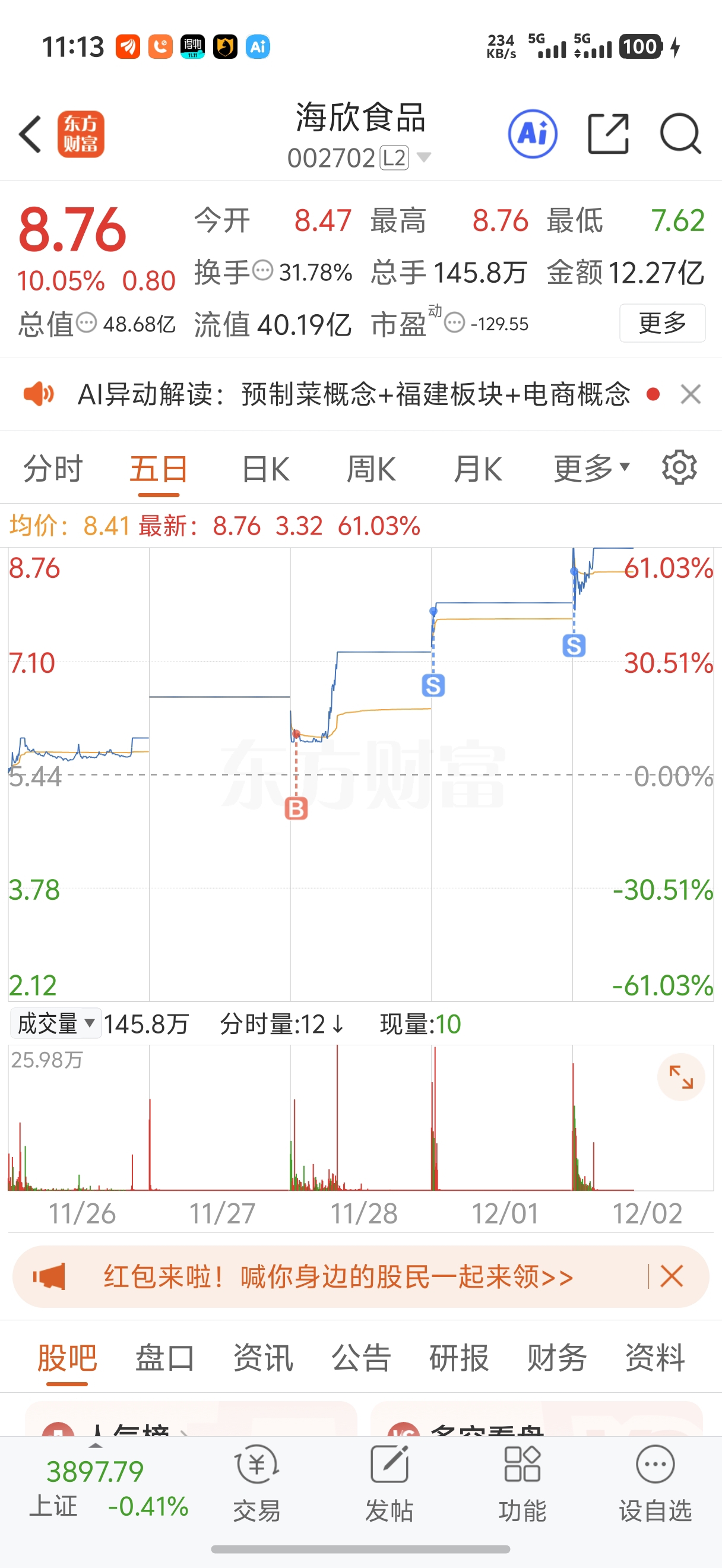 $海欣食品(SZ002702)$ 兄弟们#炒股日记# ,出完了我,今天感觉还是被动上板,安全第一留下的发财