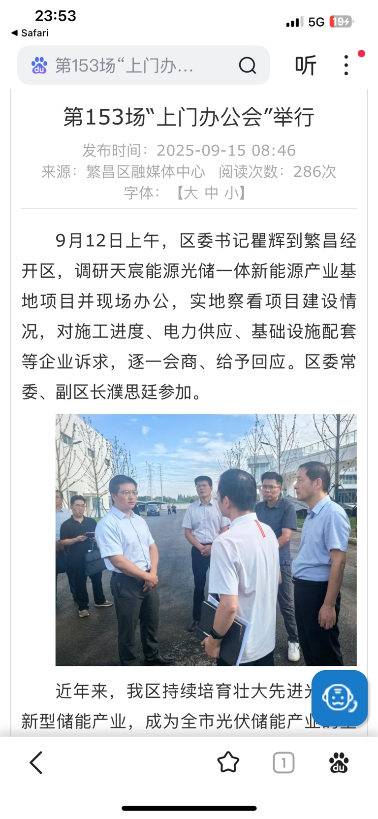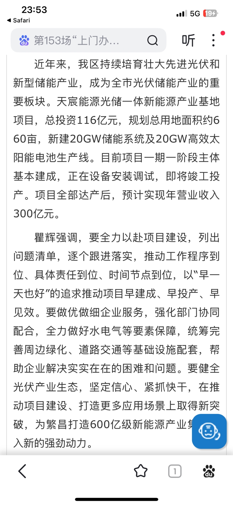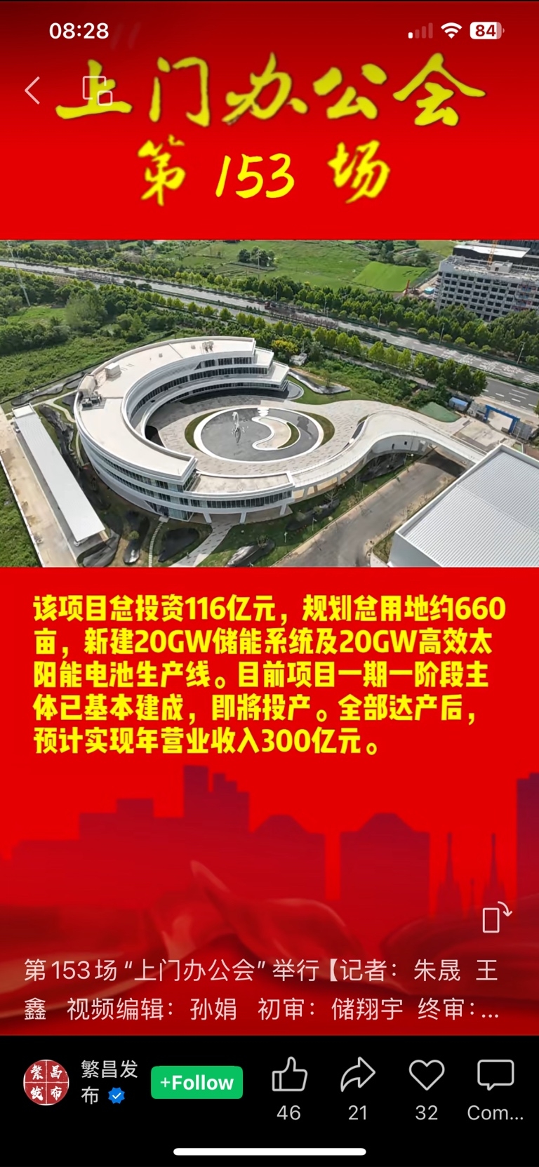 天宸能源光储一体新能源产业基地项目,总投资116亿元,规划总用地面积约660亩,新建20GW储能系统及20GW高效太阳能电池生产线。目前项目一期一阶段主体基本建成,正在设备安装调试,即将竣工投产。项目全部达产后,预计实现年营业收入300亿元。