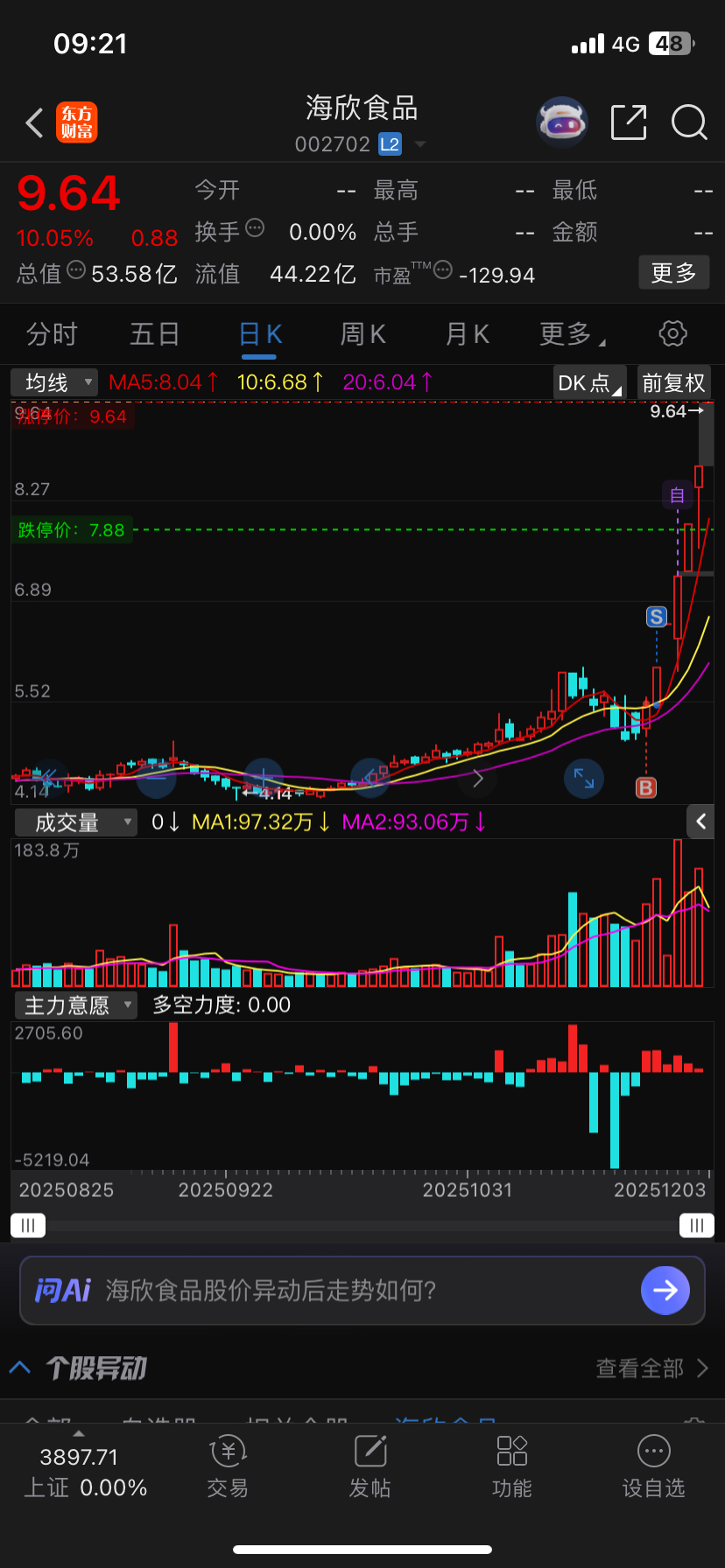 $海欣食品(SZ002702)$ 曰,不过也是,也拿不住