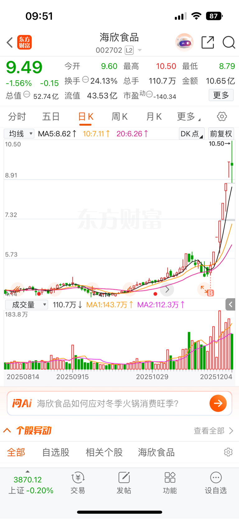 $海欣食品(SZ002702)$ 明知道你今天不行了我也不走,我还是要坚持,以前最多就吃过6板,好不容易有个给我看到更高的希望,现在只为梦想格局,加油吧