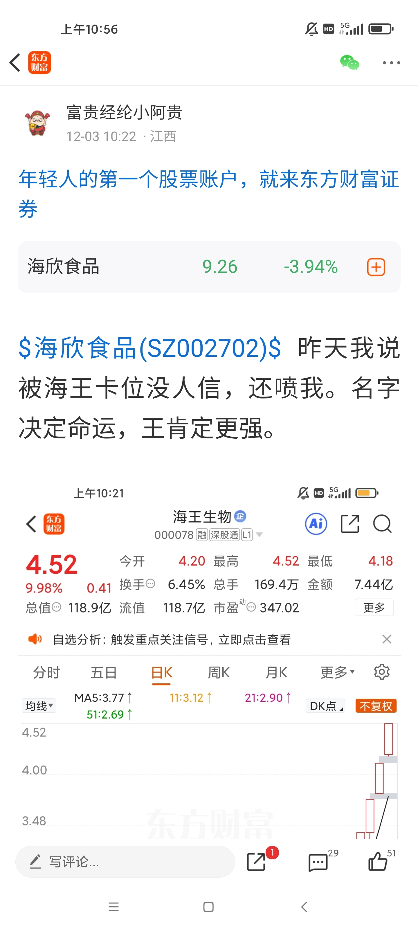 $海欣食品(SZ002702)$ 炒股票前一定要看名字,他们居然不相信,海王-王者归来。名字就更霸气