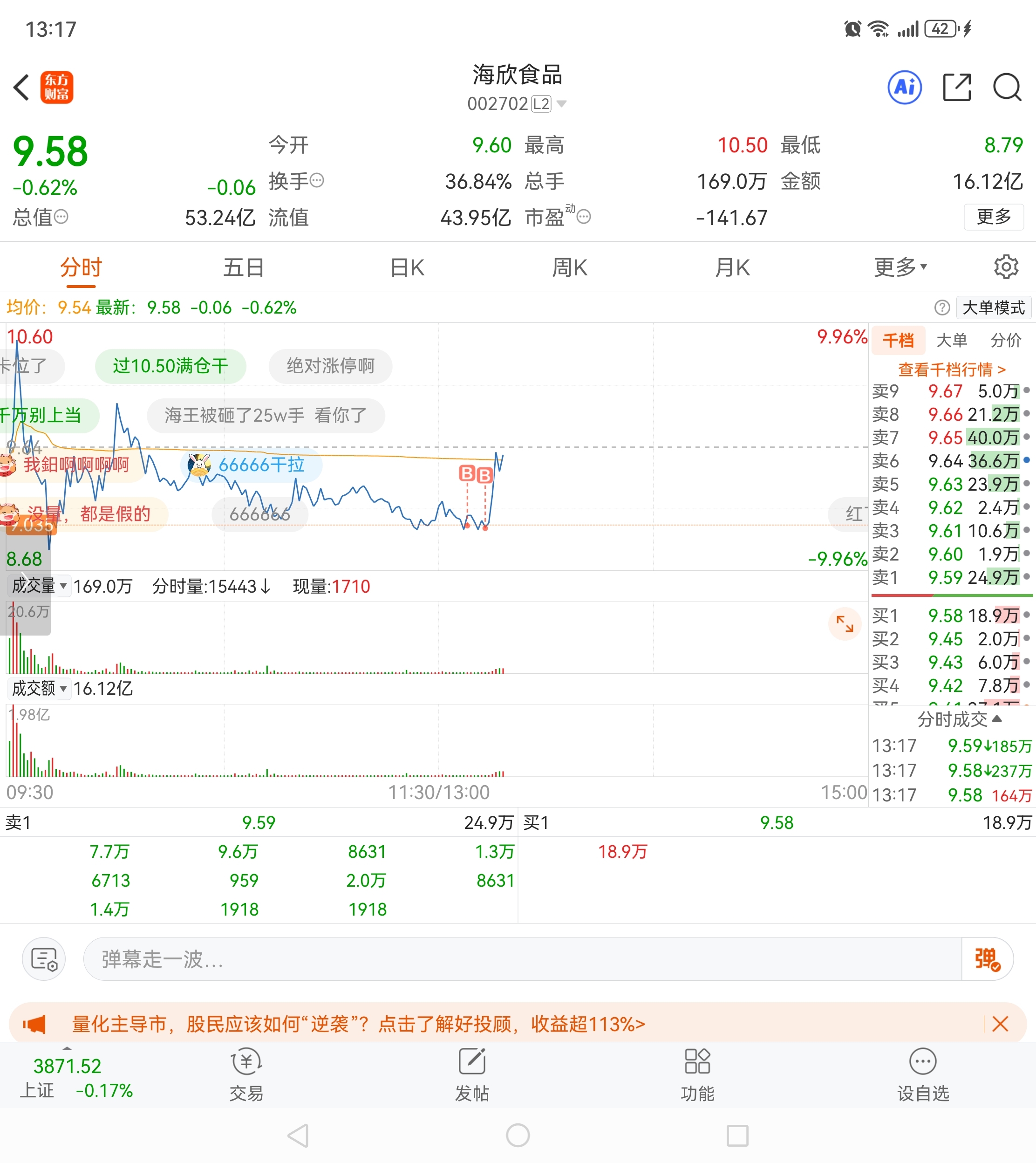 $海欣食品(SZ002702)$ 半场不能开香槟 千万别发 不信跌停给你看
