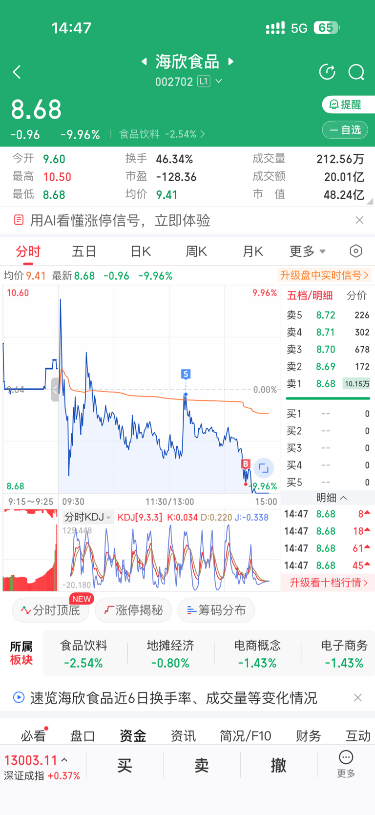 $海欣食品(SZ002702)$ 9.5跑的,没管住手8.9又去接了回来