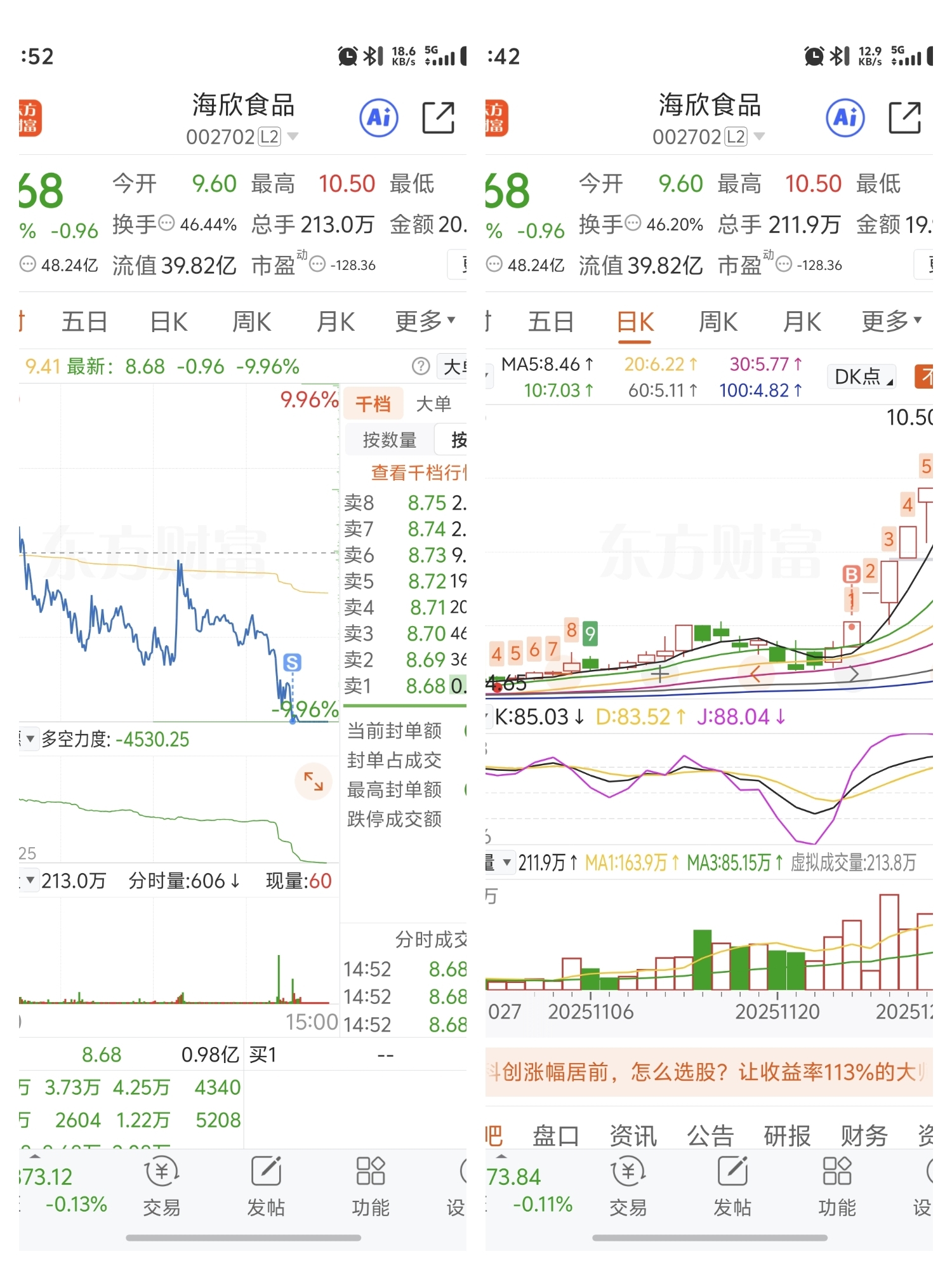 $海欣食品(SZ002702)$ 早上没反应过来止盈,结果回撤10%,格局了一天想着拉红卖还是太贪了。今天全部卖出