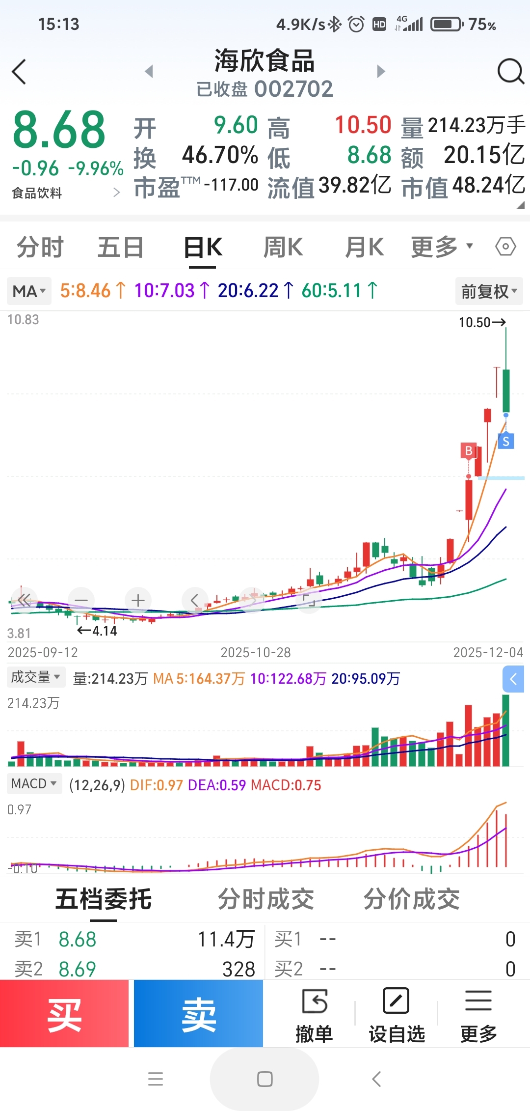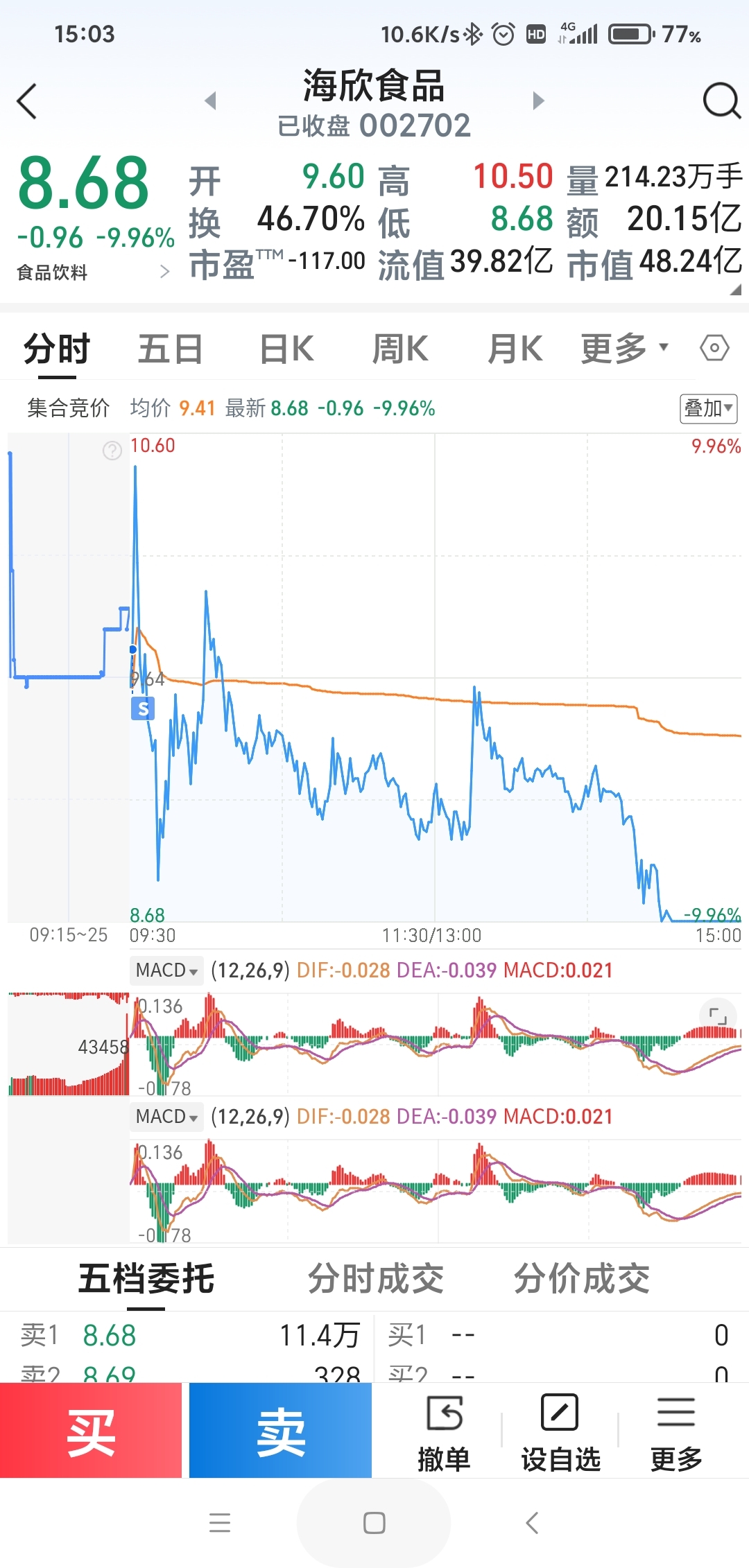$海欣食品(SZ002702)$ 早上看竞价最高都没能冲到涨停价,最高到了10.52,预估今天情况不妙,应该冲不到涨停,甚至可能出货终结,安全起见,就果断委托在最高10.52下面两毛钱附近清仓,结果开盘后冲高安全送我离开,成功逃了一次顶,虽然盘中多次震荡,但大资金全天都在不停流出,出货无疑,脉冲高点不断降低,最终跌停,从上次跌停板附近上车到跌停收尾,完整体验了一番全过程升浪