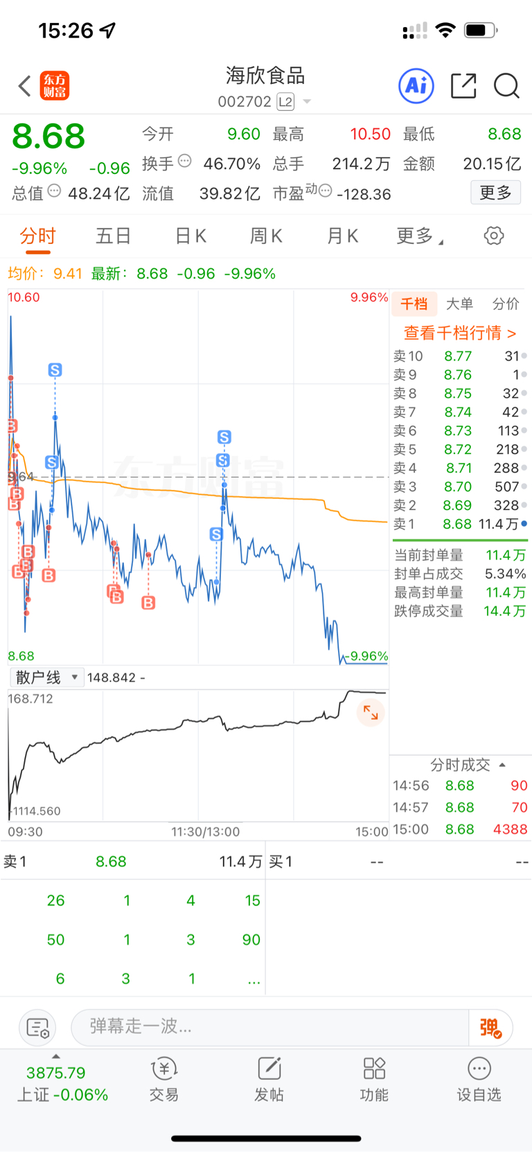 $海欣食品(SZ002702)$ 今天真惨,还好把底仓都卖了