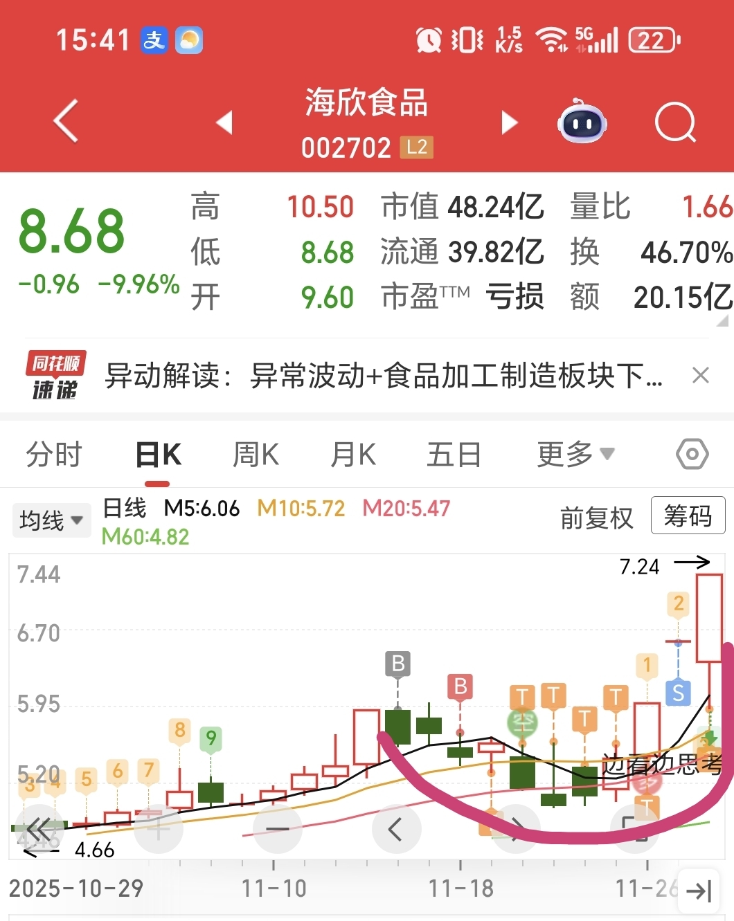 $海欣食品(SZ002702)$ 从海欣食品开始,每支票都要总结经验!海欣食品11月19日涨停板次日回调就介入,刚开始由于特别看好当天就写下目标价10元!但正是因为特别看好起了妄念一开始就上了大仓位,后面回调到4.98的时候想加已经没有资金能加仓了!总结经验:任何一支票,开始都要小仓位试错,不能上来就重仓满仓,最好就是逐步低吸,等到止跌回升再慢慢上仓位!大多数票起飞前都会挖个坑