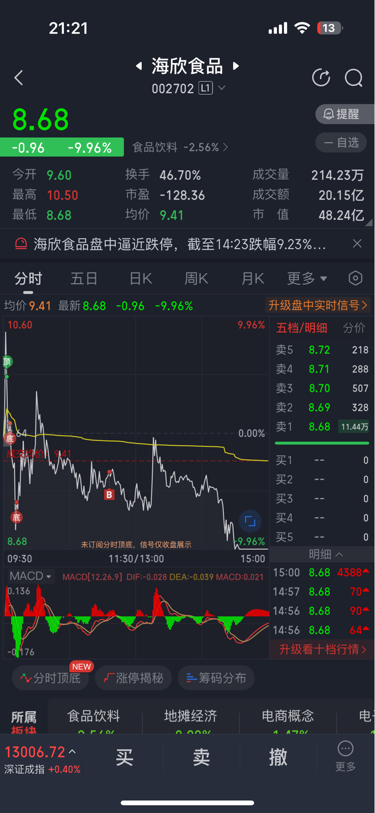 $海欣食品(SZ002702)$ 我昨天就说了今天分化的一天,也预料到了今天有可能跌停,可以看看我帖子,但是我感觉还没走完,所以昨天减仓后今天又再次加一倍仓,年底就是消费主线,其他题材都是轮动,没什么持续性,做等下一波反包