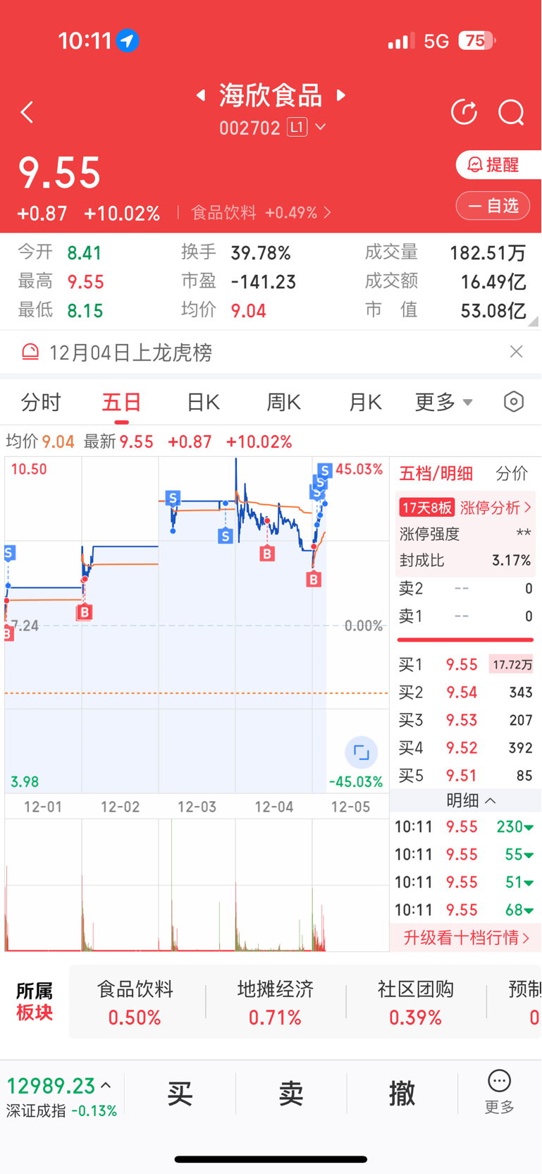 $海欣食品(SZ002702)$ 如我之前说所说,昨天有可能跌停,今天要反包,怎么样?昨天水下加仓今天开盘价继续加仓,拉上去卖出,我是第三个板跌跌停买入,做T现在已经是翻一倍了利润,逻辑看清楚了就能吃大肉