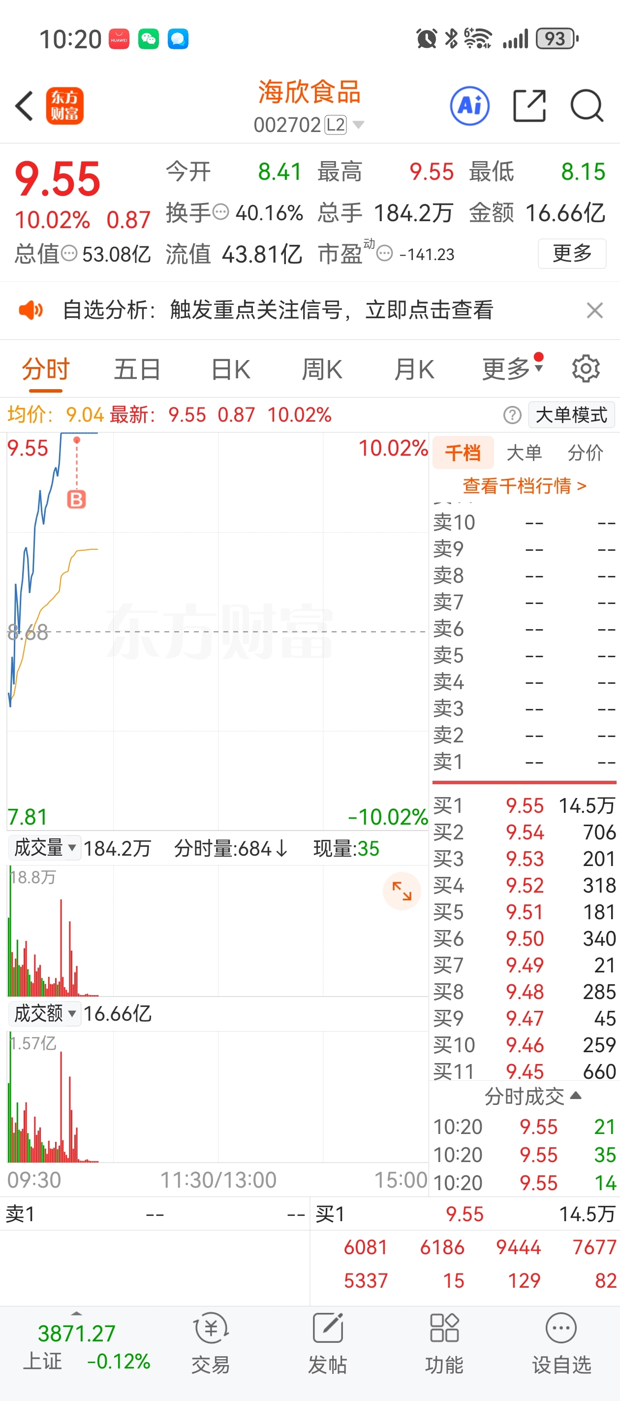 $海欣食品(SZ002702)$ 开板瞬间秒扫的,今天会不会再开板?