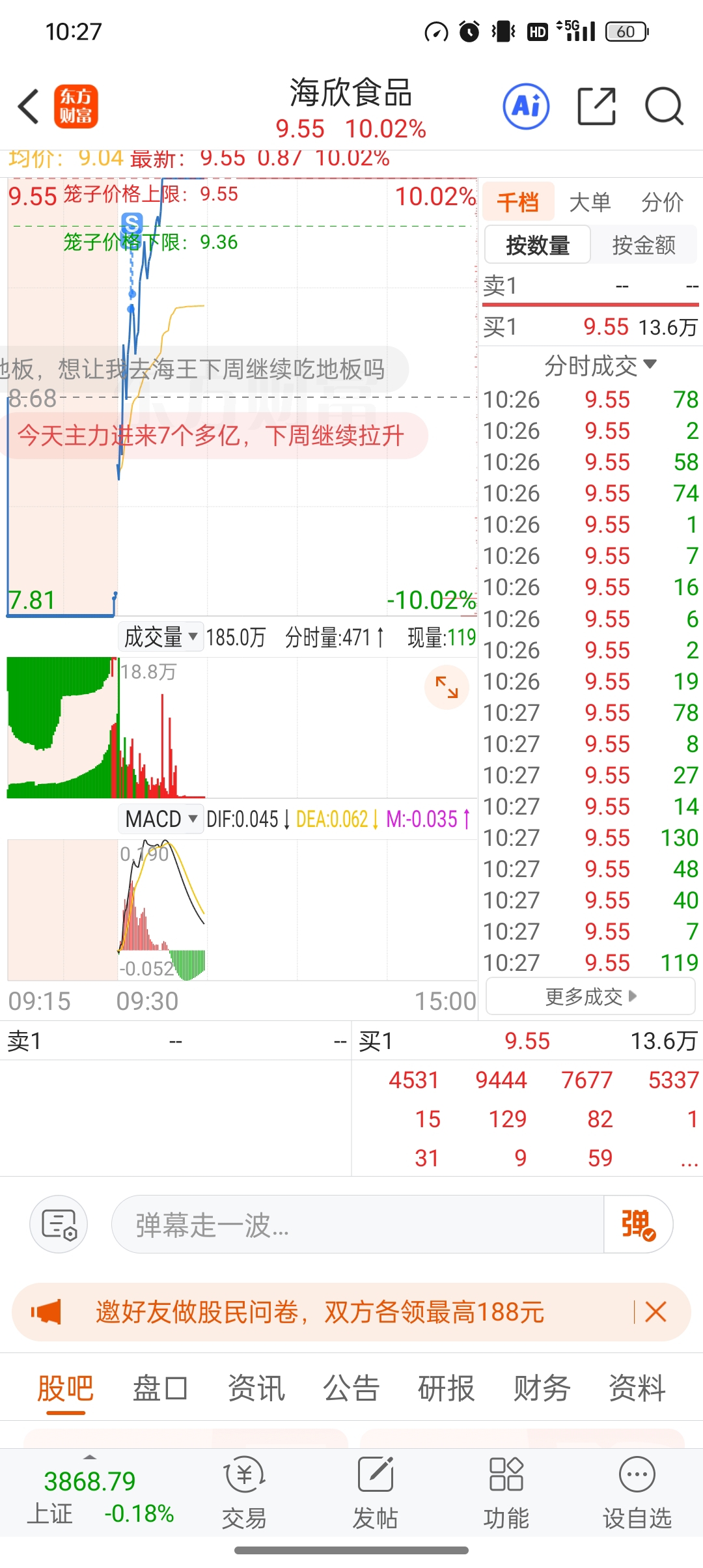 $海欣食品(SZ002702)$ 溜了,太刺激了,大家发财