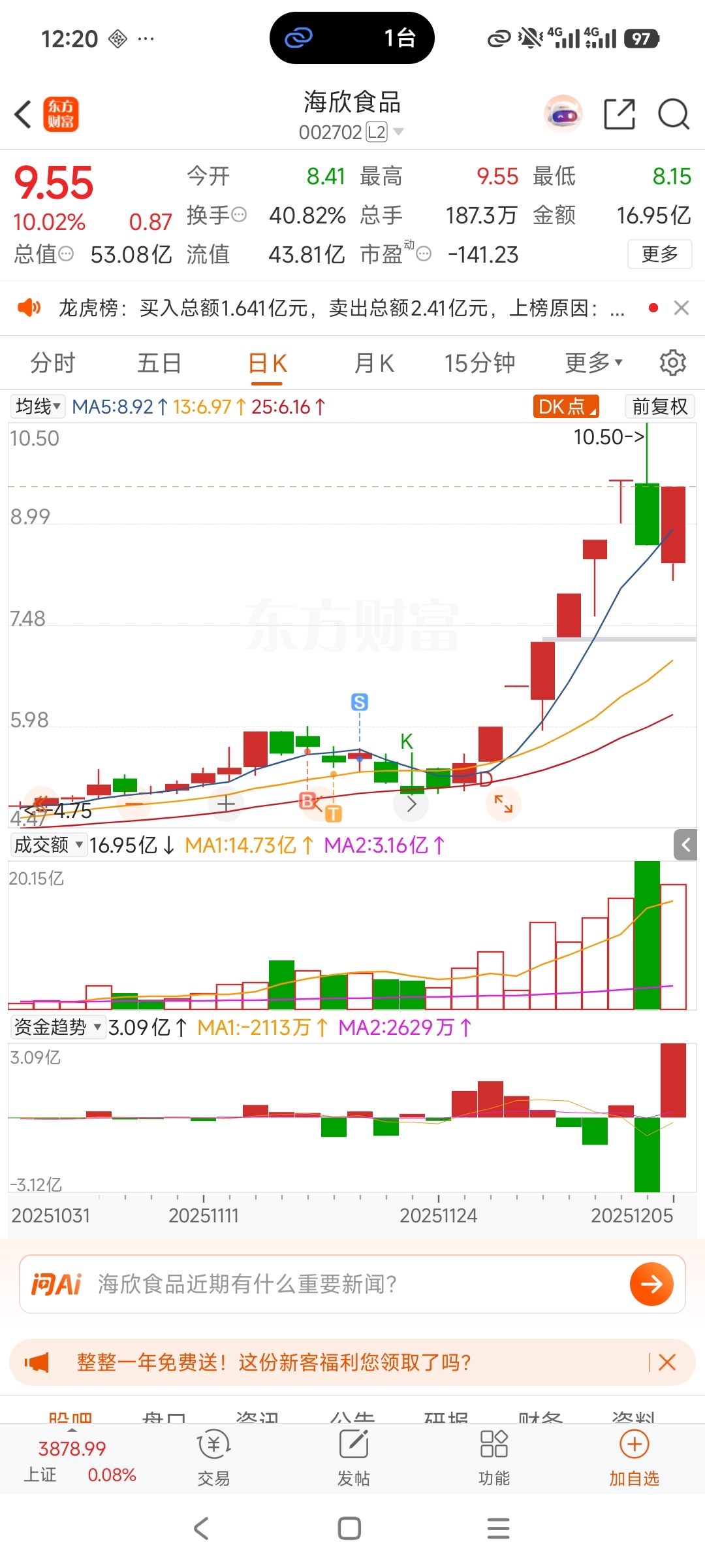 $海欣食品(SZ002702)$ 不让赚钱啊,亏20万,还在涨。。。。。。。。。