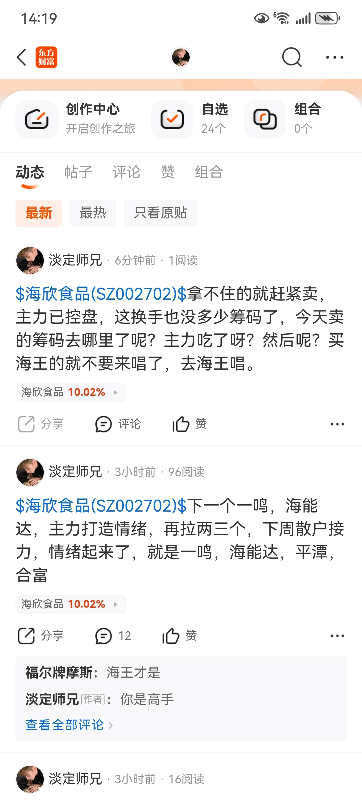 $海欣食品(SZ002702)$ 昨天换手46.7,今天换手已经42,难道昨天主力的筹码4.7都没有吗?今天到底是谁跑了?大部分是散户呀,有主力跑了一些,剩下的都是多头主力,拿得住的一百个人也就是一两个吧。