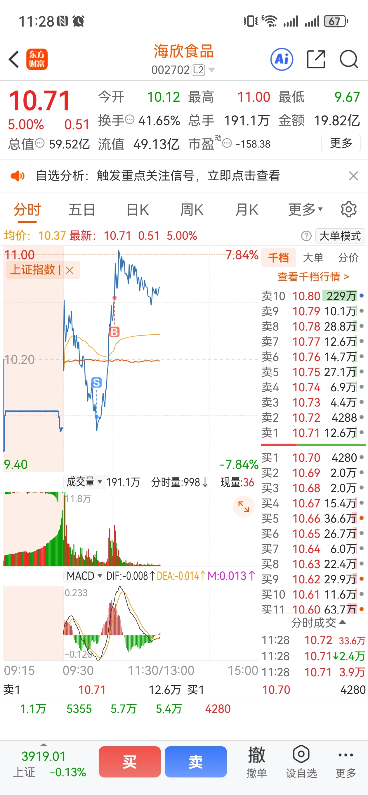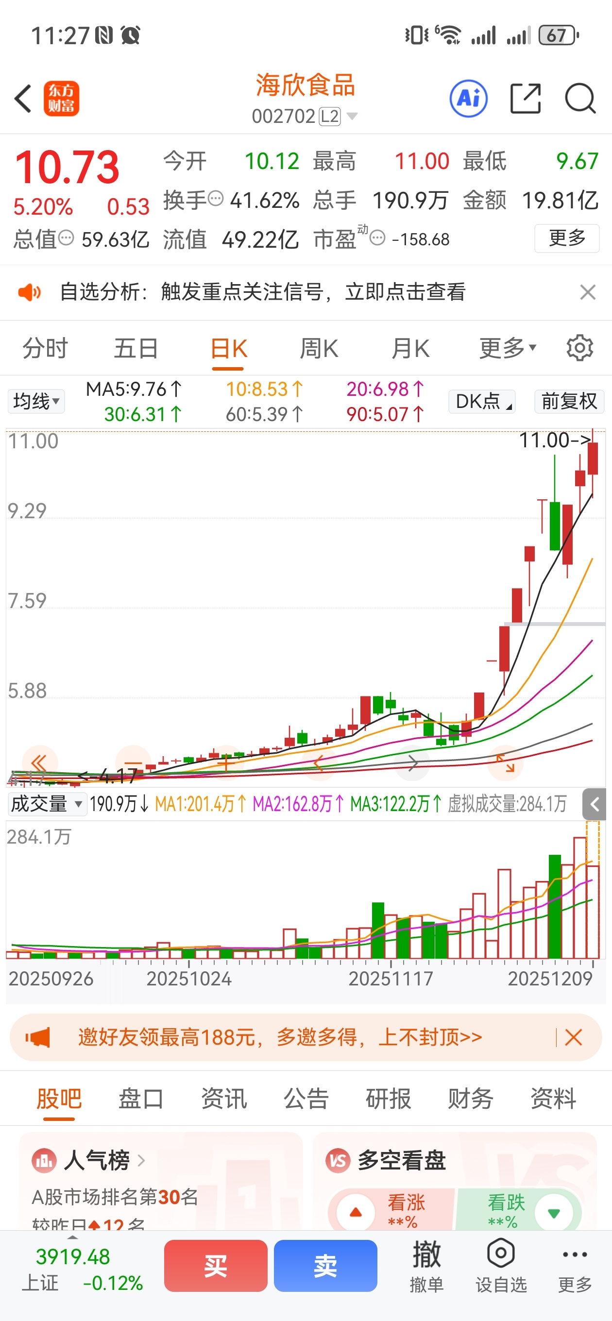 $海欣食品(SZ002702)$ 你们真强!一踩五日线就拉升!!!