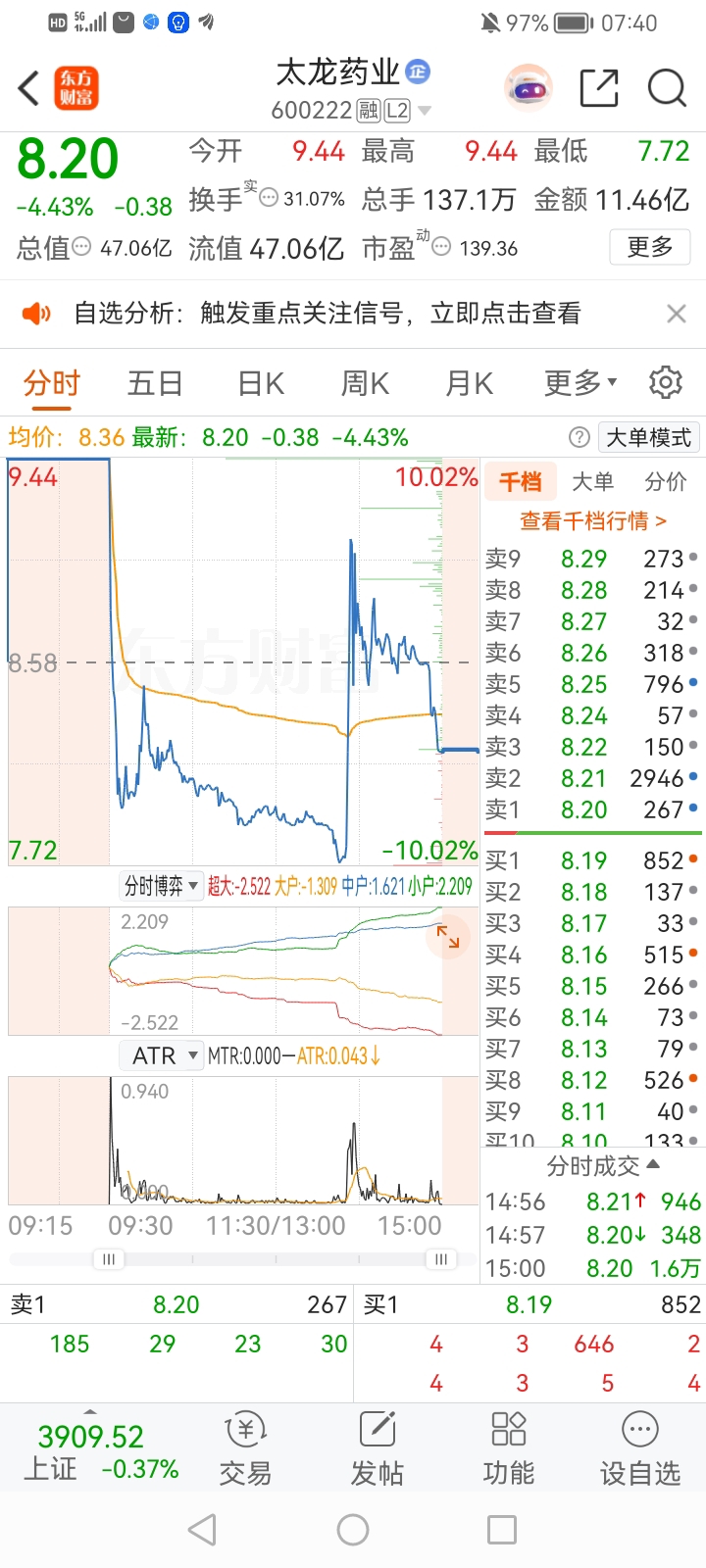 太龙药业主力想学四方新材和德力股份天地天板,奈何主力没实力!太龙药业首板天地板,