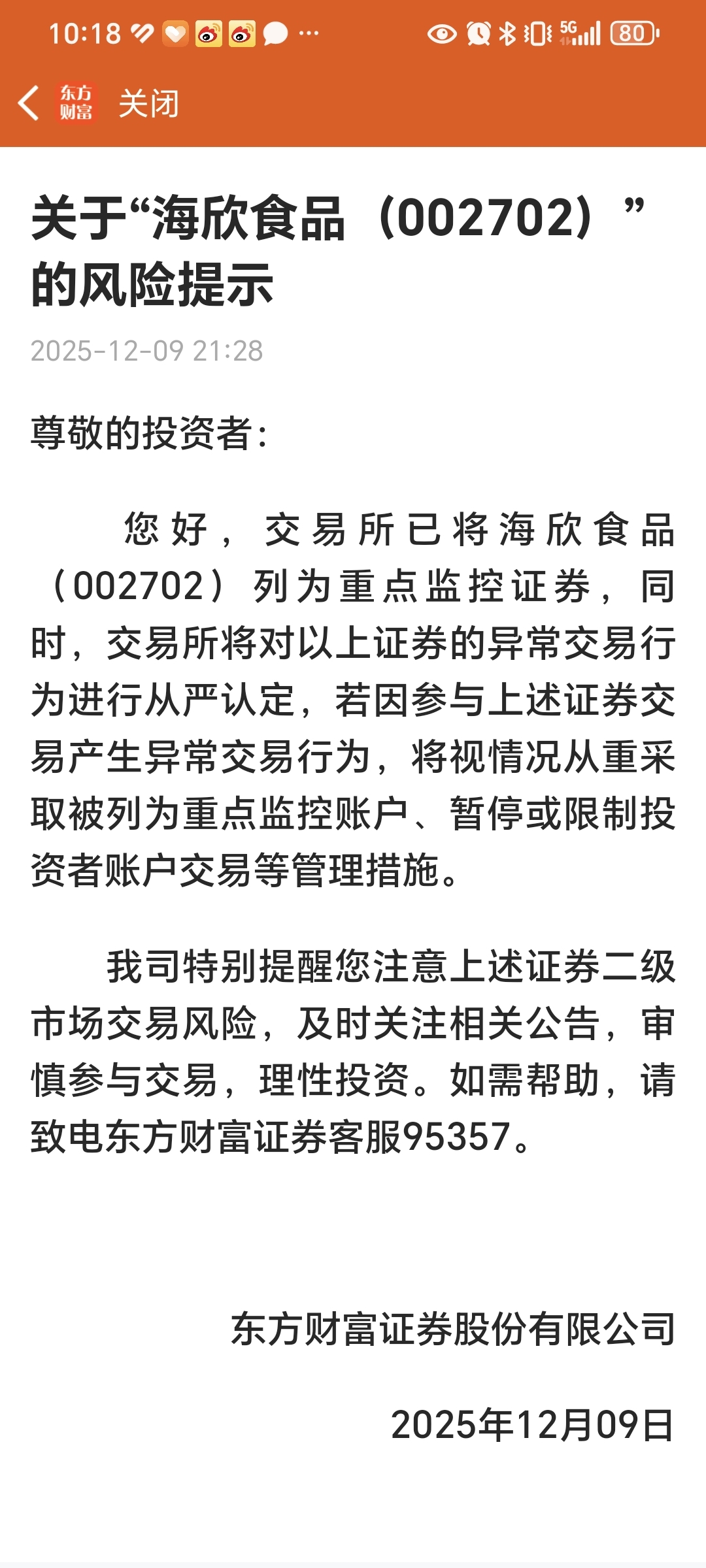 $海欣食品(SZ002702)$ 各位大哥请注意该股