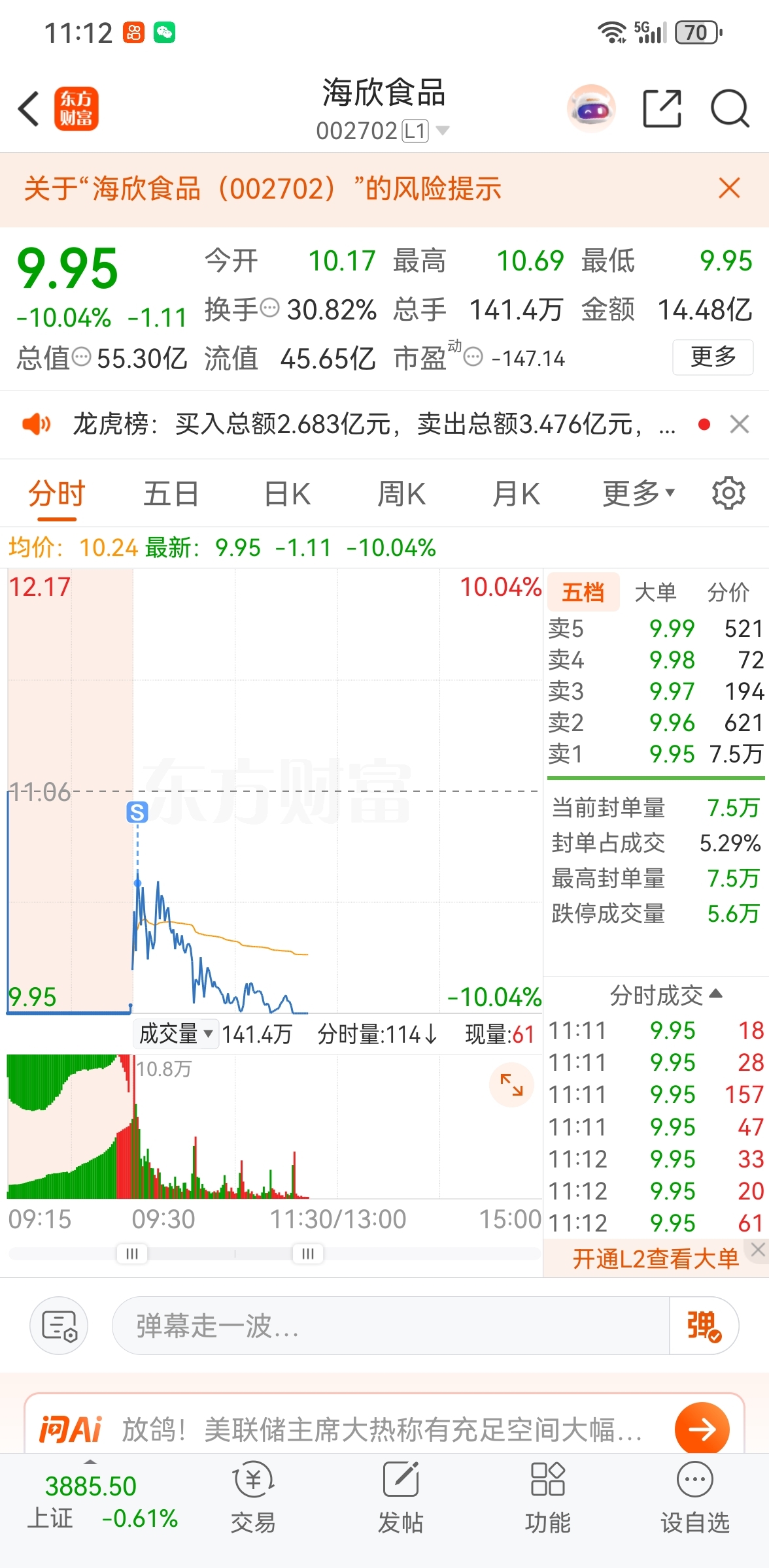 $海欣食品(SZ002702)$ 赚了34块跑了