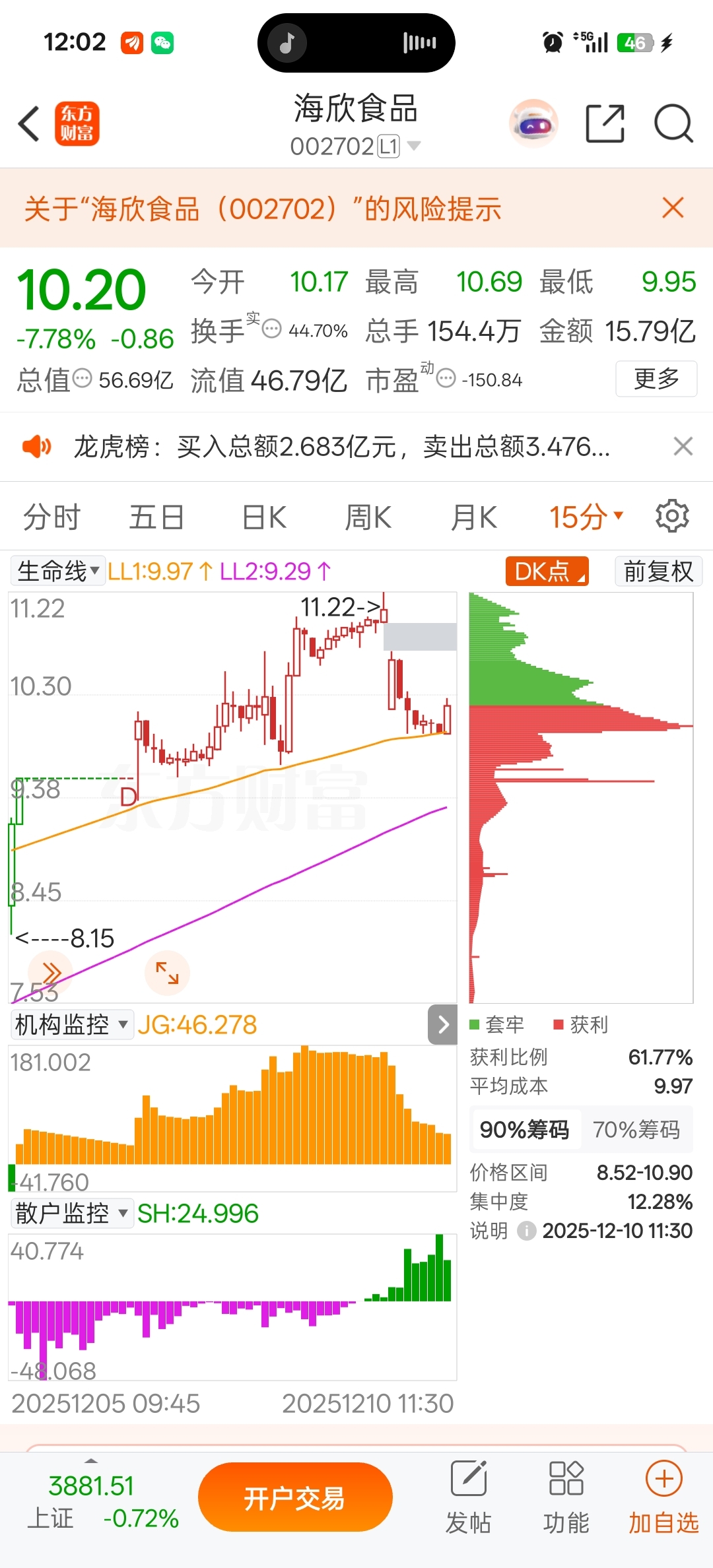 $海欣食品(SZ002702)$ 机构一上午一直在吃筹码