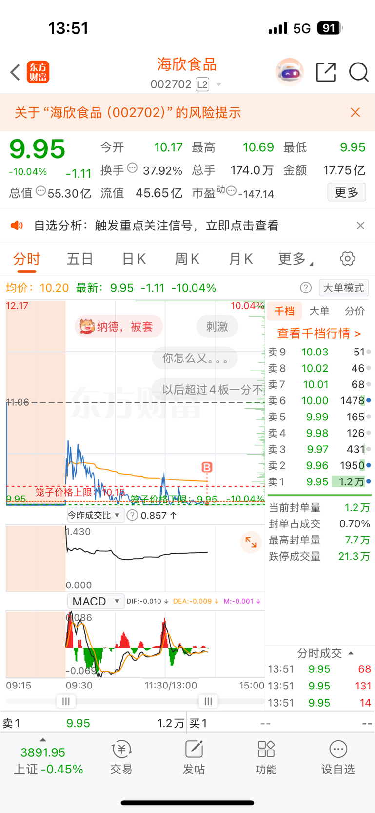$海欣食品(SZ002702)$ 赌一赌明天能否涨了