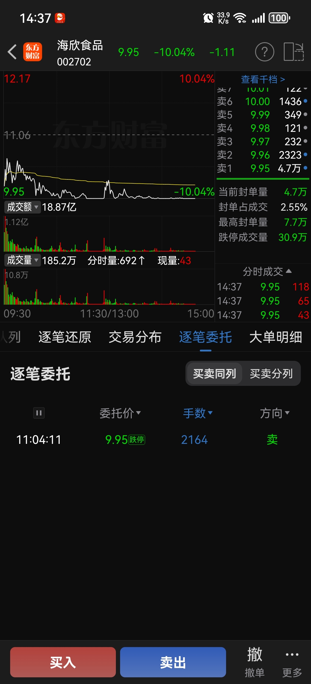 $海欣食品(SZ002702)$ 昨天最后顶进监管的几笔都割跌停了,活该