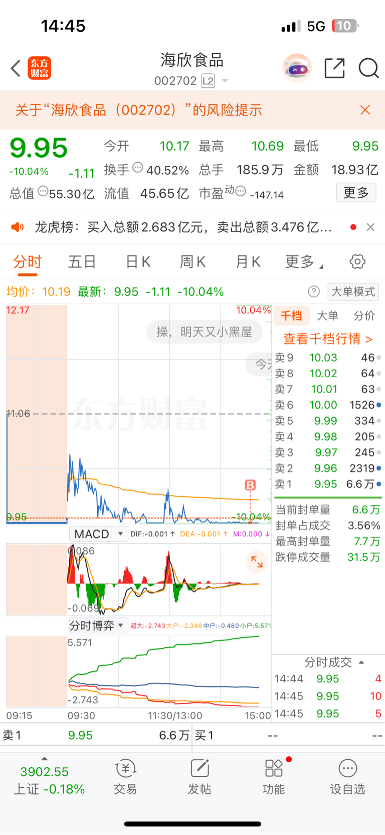 $海欣食品(SZ002702)$ 别怪我没帮忙,我买了一手,翘板,买完就后悔了,手续费竟然收了我5块