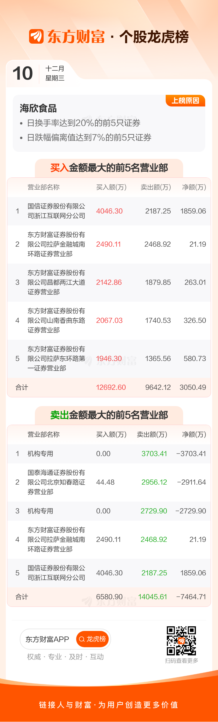 交易所2025年12月10日公布的交易公开信息显示,海欣食品因成为日换手率达到20%的前5只证券、日跌幅偏离值达到7%的前5只证券上榜。海欣食品当日收报9.95元,涨跌幅-10.04%,偏离值41.08%,换手率41.08%,成交额19.19亿。